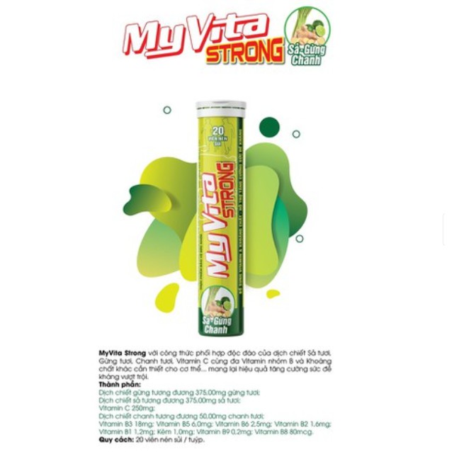 Hãy uống Myvita Strong để bổ sung vitamin, tăng cường sức đề kháng mỗi ngàyThành phần có trong một viên nén sủi bọt MYVITA STRONG:-Dịch chiết gừng tương đương 375,00mg -Dịch chiết sả tương đương 375,00mg -Vitamin C 250mg-Dịch chiết chanh tương đương 50,00mg -Vitamin B3 18mg; -Vitamin B5 6,0mg; -Vitamin B6 2,5mg; -Vitamin B2 1,6mg; -Vitamin B1 1,2mg; -Kẽm 1,0mg; -Vitamin B9 0,2mg; -Vitamin B8 80mg- Tá dược: vừa đủ 1 viên nén sủi bọt.G DỤNG:Giúp bổ sung vitamin C, hỗ trợ tăng cường sức đề kháng cho cơ thể.ĐỐI TƯỢNG SỬ DỤNG:Người mêt mỏi, sức đề kháng kém. Người có chế độ ăn thiếu vitamin, kẽm. Người cần tăng cường sức đề kháng.#vitamin #vita #myvita # #vitaminc #tangdekhang #giammetmoi #suynhuoccothe #spm #myvitapower #power #khoangchat #khoemanh #vitaminB #calci #kẽm #đồng