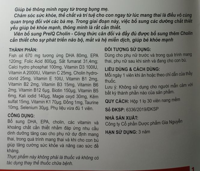viên bổ sung Pre IQ là sản phẩm do công ty dược phẩm Bạch Mai sản xuấtgiúp bé thông minh ngau từ trong bụng mẹchăm sóc sức khỏe, thể chất và trí tuệ cho con ngay từ lúc trong mang thai là điều vô cùng quan trọng với các bà mẹ. trong giai đoạn này, việc bổ sung các dưỡng chất thiết yếu giúp bé khỏe mạnh, thông minh là rất cần thiếtviên bổ sung PreIQ cholin - công thức cân đối và đầy đủ được bổ sung thêm cholin cần thiết cho sự phát triển não bộ, mắt và hệ miễn dịch, giúp bé khoe mạnhthành phần xem trên ảnh shop đăngcông dụng : bổ sung DHA, EPA, cholin,  các vitamin và khoáng chất cần thiết nhằm đáp ứng nhu cầu dinh dưỡng tăng cao cho phụ nữ dự định mang thai, trong qua trình mang thai và khi cho con bú  giúp tăng cường sức khoe nâng cao sức đề khángliều dùng: mỗi ngày 1 viên sau khi ănsản phẩm cam kết chính hãng. có cung cấp hóa đơn đỏ nếu khách có nhu cầu( hóa đơn đỏ + 10%)#vitamin bà bầu #vitamin
