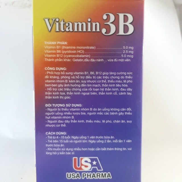 Tác dụng của vitamin 3B Với thành phần và dược lực học như trên, vitamin 3B được sử dụng phổ biến trong y học để đ.i.ề.u t.r.ị các bệnh lý khác nhau như: - đ.i.ề.u t.r.ị dự phòng trường hợp thiết vitamin nhóm B đặc biệt với những người nghiện rư.ợu lâu năm, kém ăn, mất ngủ hay bị suy nhược thần kinh. - Vitanim 3B được chỉ định hỗ trợ đ.i.ề.u t.r.ị trong các trường hợp đau nhức thần kinh, đau nhức thần kinh cơ, đau nhức do thấp khớp. Hỗ trợ đ.i.ề.u t.r.ị và phòng ngừa các rối loạn thần kinh ngoại vi như viêm đa dây thần kinh (đau dây thần kinh tọa, co giật do tăng cảm ứng của hệ thống thần kinh trung ương di cảm, hội chứng vai – cánh tay, đau lưng, đau thắt lưng, đau thần kinh liên sườn, đau dây thần kinh sinh ba, tê cứng các đầu chi,…). Giảm đau trong đau dây thần kinh, bệnh lý thần kinh do tiểu đường gây nên (do bệnh nhân nghiện rư.ợu nặng hoặc do thuốc), các rối loạn do bị thiếu hụt vitamin nhóm B (vitamin B1 – B6 – B12).