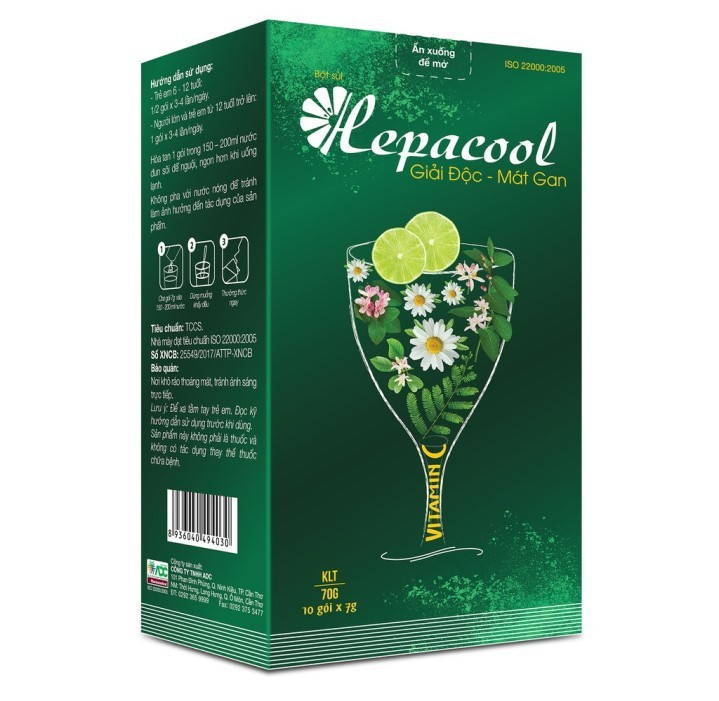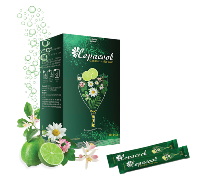 *Thành Phần Bột sủi Hepacool:-Chiết xuất chanh: 1000mg-Kim ngân hoa: 300mg-Cúc hoa trắng: 300mg-Diệp hạ châu: 100mg-Vitamin C: 70mg-Tá dược: Acid citric, natri bicarbonate, sucrose vừa đủ 7g
