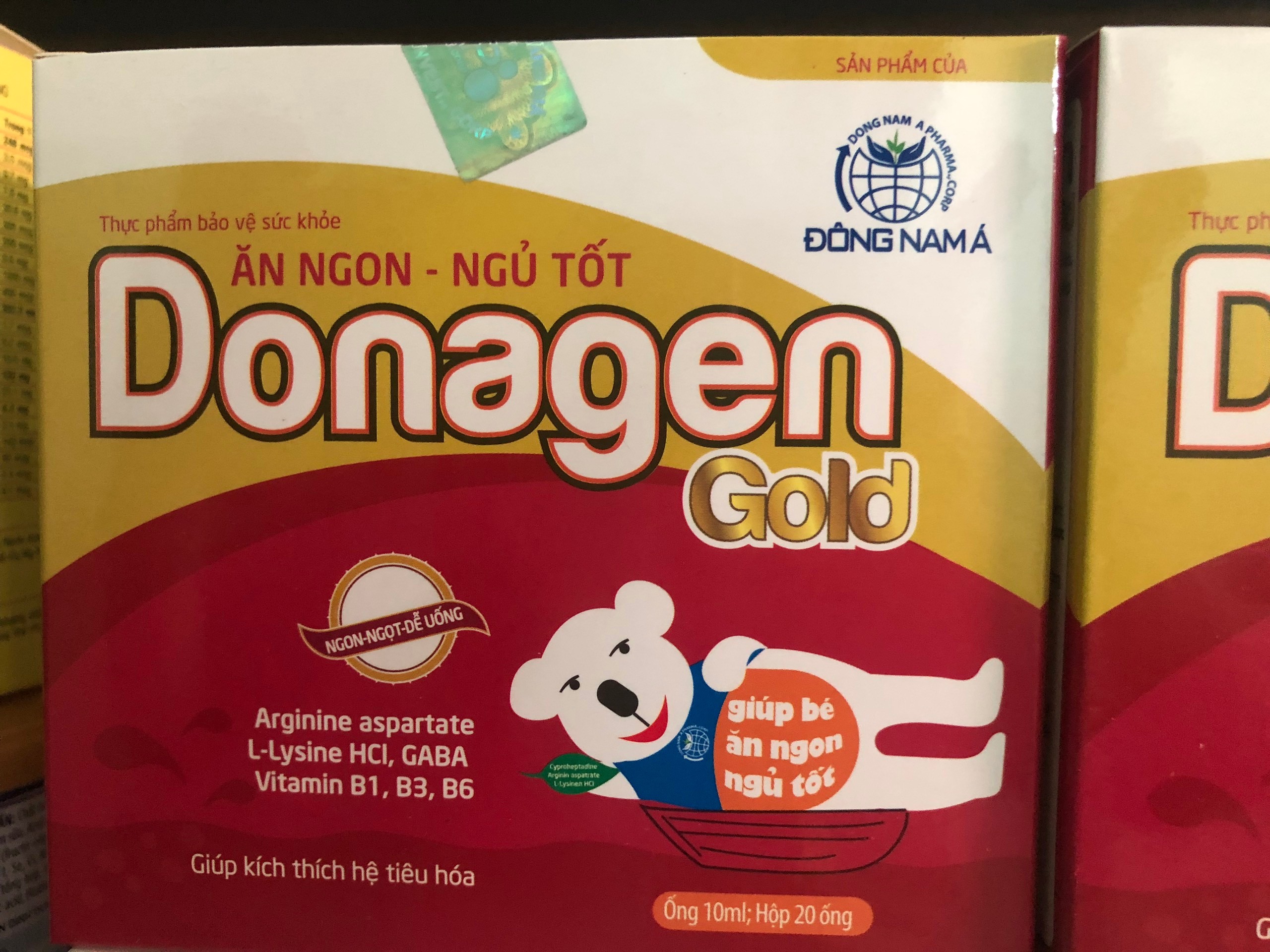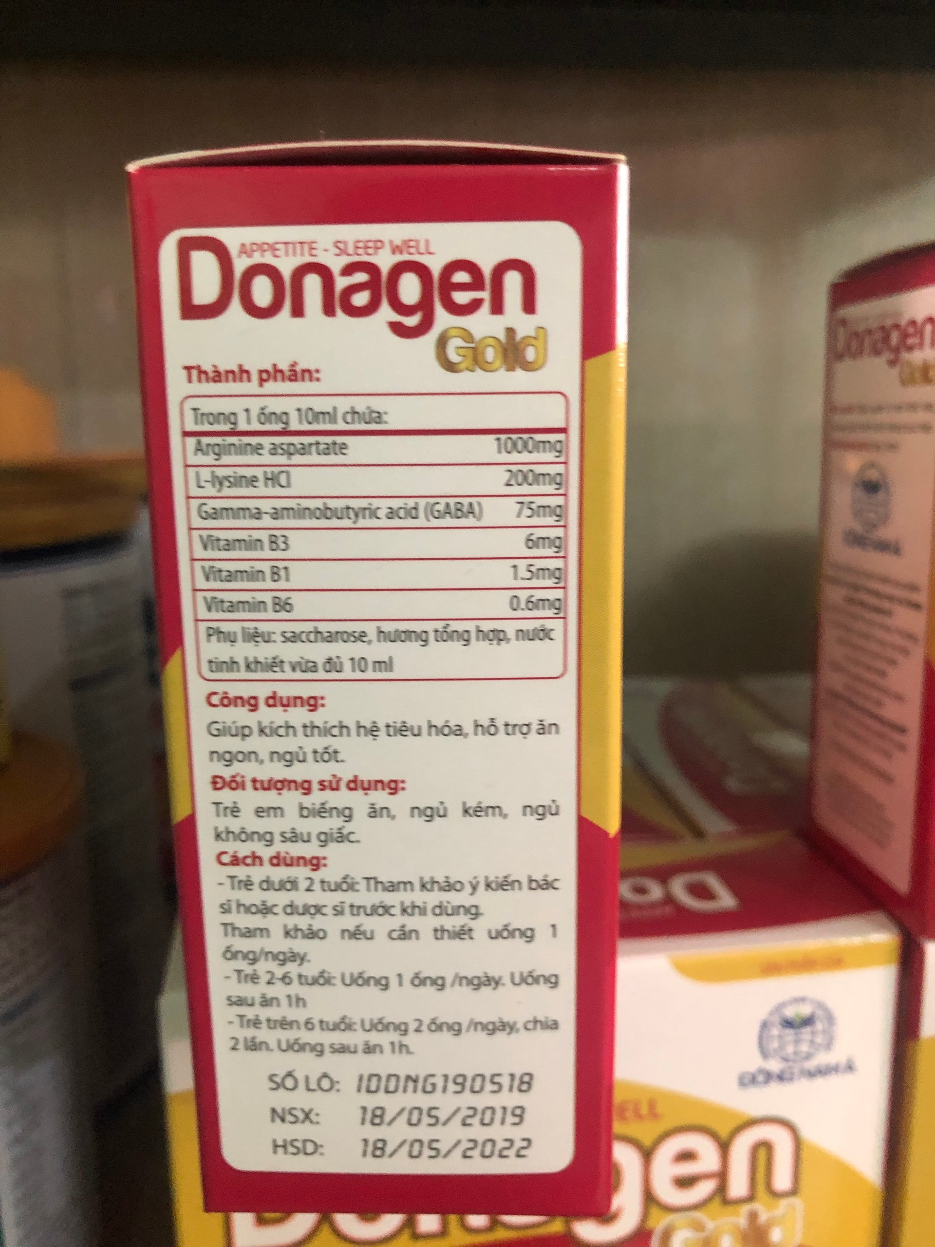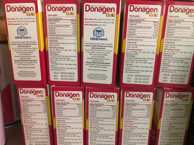 Thành Phần:Cyproheptadine...................... 1.0mgArginin aspatrate....................1000mgL-lysine HCL...........................100mgCông dụng:_Giúp ăn ngon, ngủ tốt._Thúc đẩy sự phát triển thể chất._Giúp phục hồi cơ thể trong trường hợp suy nhược cơ thể, ăn ngủ kém._Giúp tăng cường chức năng tiêu hóa.Donagen - giúp bé ăn ngon ngủ tốtDonagen - giúp bé ăn ngon ngủ tốtĐối tượng sử dụng:_Trẻ em tiêu hóa kém, biếng ăn, chậm lớn._Người lớn và trẻ em suy nhược cơ thể, suy nhược chức năng, ăn kém ngủ kém.Cách dùng:Hương vị thơm ngọt dễ uống với trẻ nhỏTrẻ dưới 2 tuổi: Hỏi ý kiến bác sỹ trước khi sử dụng.Trẻ từ 2 tuổi trở lên: Uống 1 ống/ 1 ngày.Người lớn: Uống 2 ống/ 1 ngày, chia 2 lần.