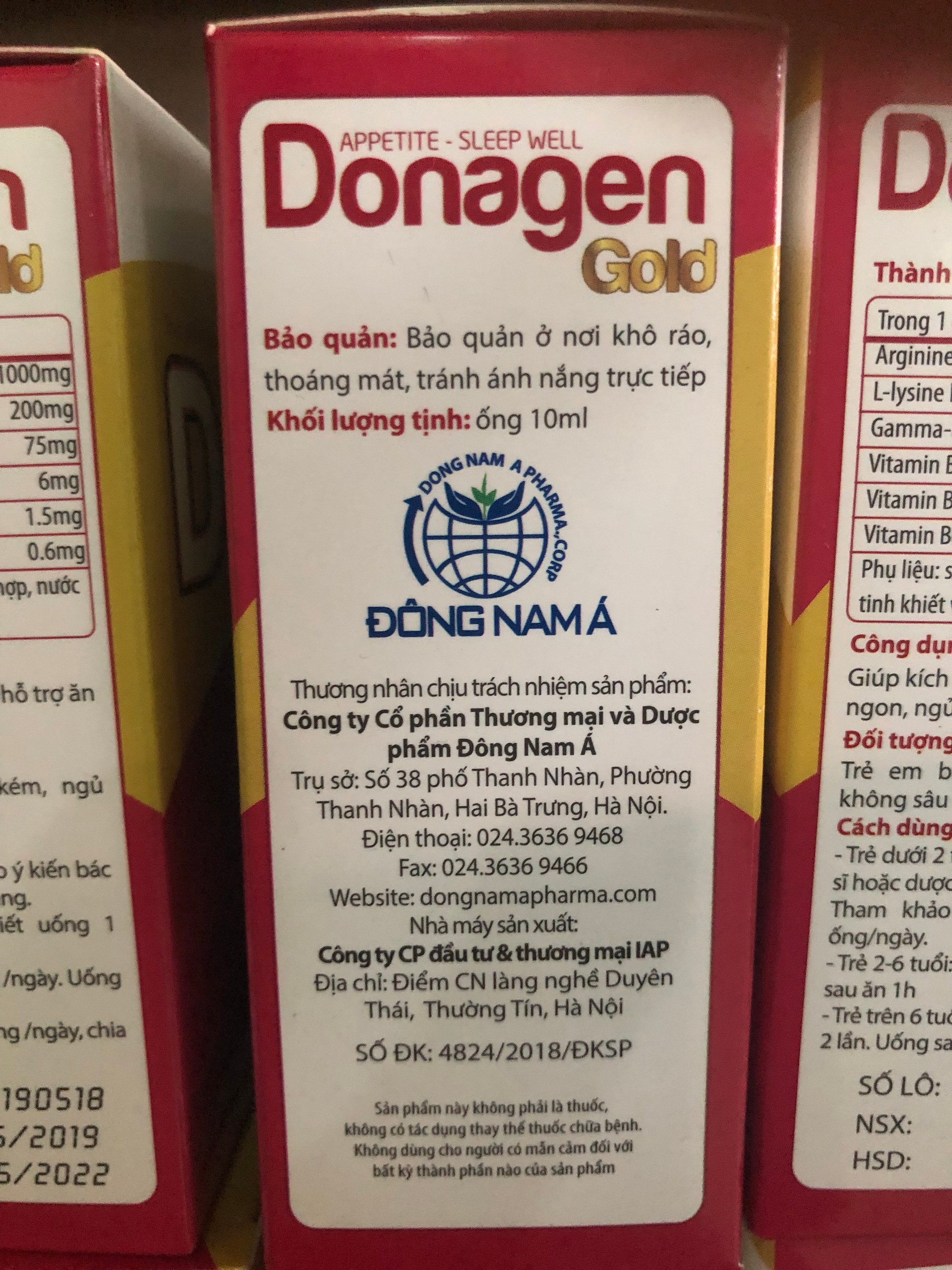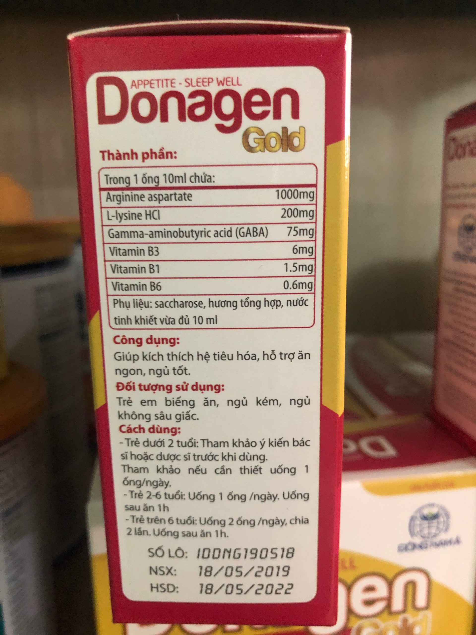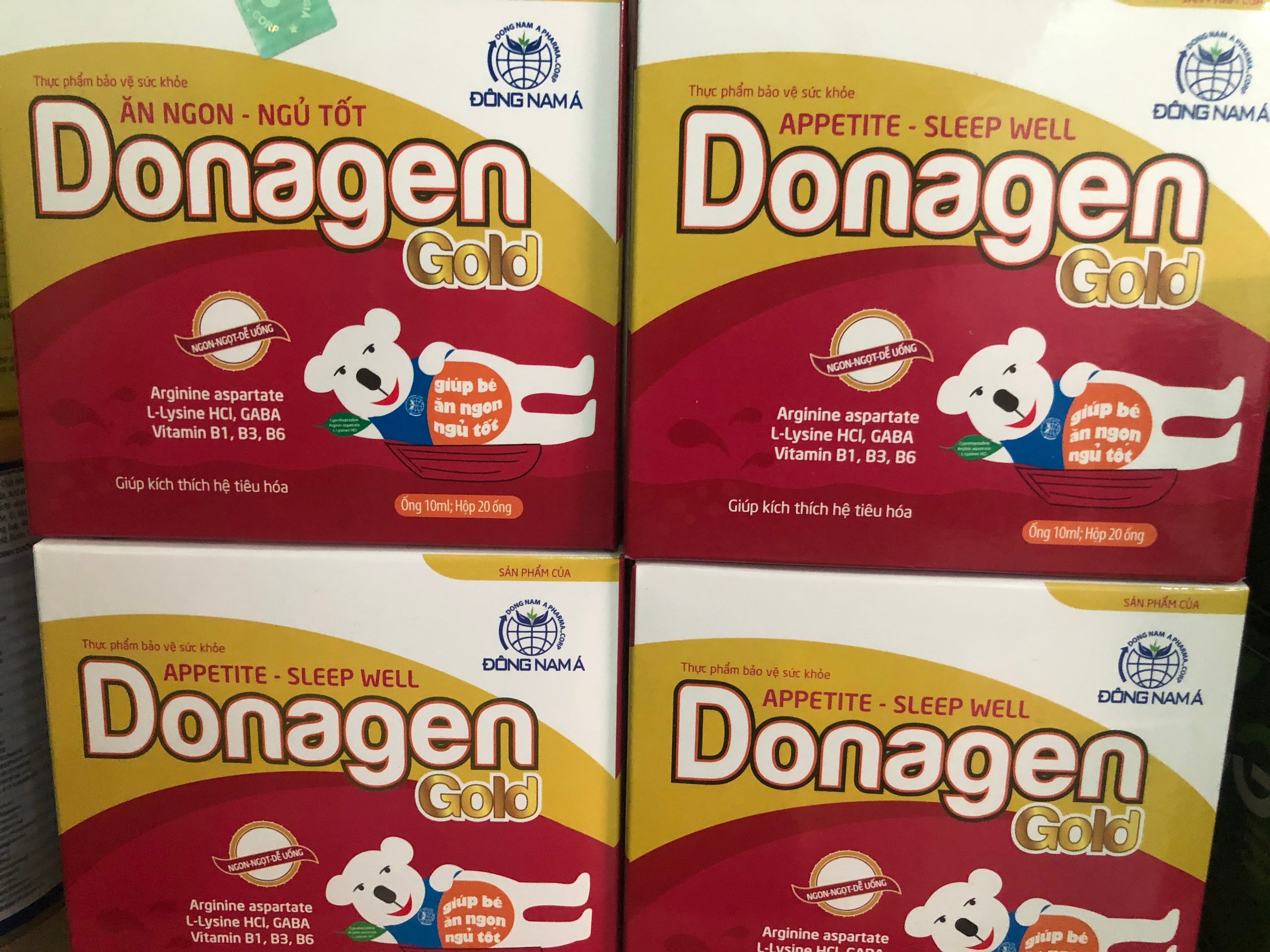 Thành Phần:Cyproheptadine...................... 1.0mgArginin aspatrate....................1000mgL-lysine HCL...........................100mgCông dụng:_Giúp ăn ngon, ngủ tốt._Thúc đẩy sự phát triển thể chất._Giúp phục hồi cơ thể trong trường hợp suy nhược cơ thể, ăn ngủ kém._Giúp tăng cường chức năng tiêu hóa.Donagen - giúp bé ăn ngon ngủ tốtDonagen - giúp bé ăn ngon ngủ tốtĐối tượng sử dụng:_Trẻ em tiêu hóa kém, biếng ăn, chậm lớn._Người lớn và trẻ em suy nhược cơ thể, suy nhược chức năng, ăn kém ngủ kém.Cách dùng:Hương vị thơm ngọt dễ uống với trẻ nhỏTrẻ dưới 2 tuổi: Hỏi ý kiến bác sỹ trước khi sử dụng.Trẻ từ 2 tuổi trở lên: Uống 1 ống/ 1 ngày.Người lớn: Uống 2 ống/ 1 ngày, chia 2 lần.