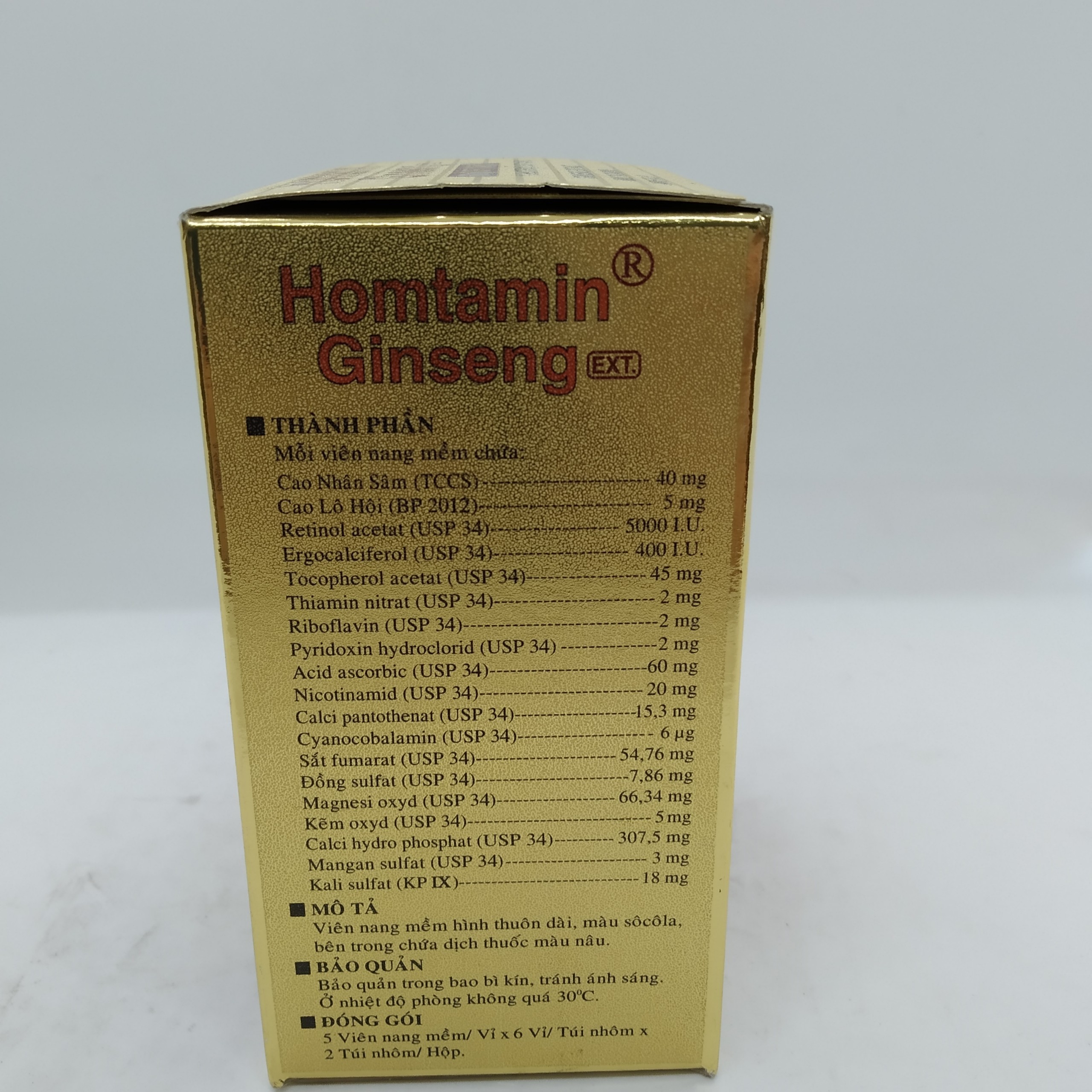 Dược chất chính: Cao nhân sâm đã định chuẩn Ginseng ext. (tương đương với 0,9 mg Ginsenoid Rb1, Rg1 và Re) 40 mg; Cao lô hội 5 mg; Retinol acetat 5000 IU; Ergocalciferol 400 IU; Tocopherol acetat 45 mg; Thiamin nitrat 2 mg; Riboflavin 2 mg; Pyridoxin hydroclorid 2 mg; Aci