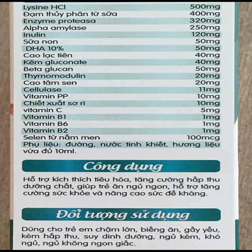 Thành phần ,công dụng ,đối tượng sử dụng : Cách dùng :Trẻ từ 0 - 24 tháng : uống 10 ml /ngày Trẻ 2-9 tuổi uống 140.000đ