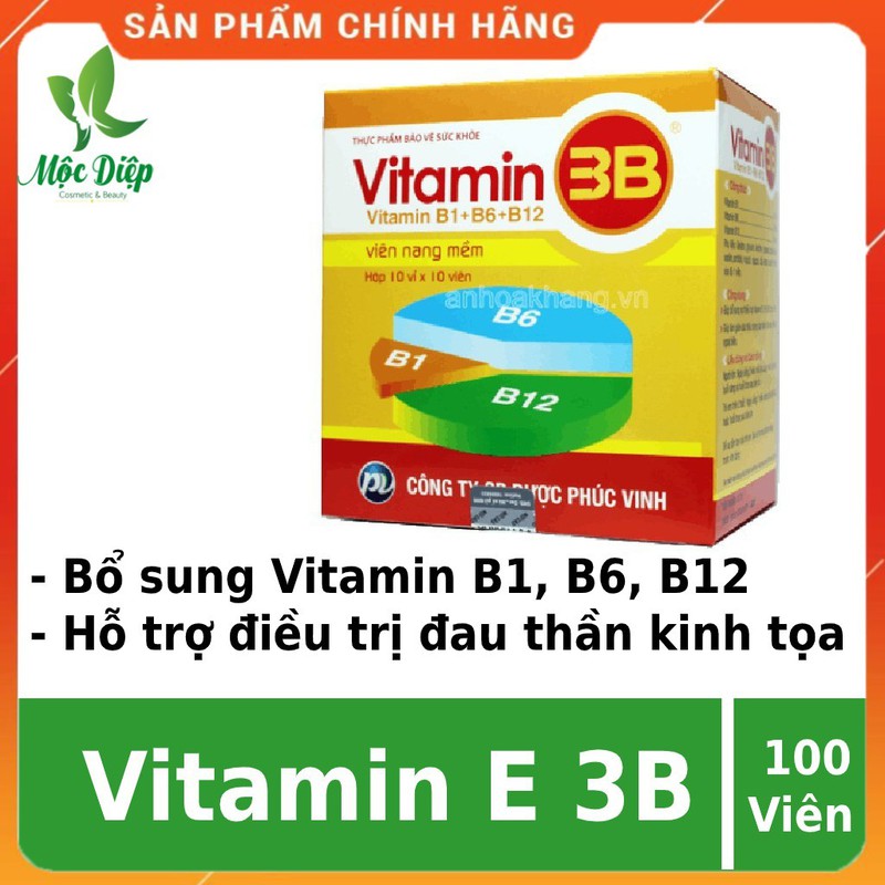 Viên uống bổ sung Vitamin B Vitamin 3BTên sản phẩm: Vitamin 3BQuy cách: Hộp 100 viênThương hiệu: Phúc VinhXuất xứ: Việt Nam✅BẠN BIẾT GÌ VỀ VITAMIN 3BVitamin 3B đều là những vitamin thiết yếu, tham gia nhiều quá trình chuyển hóa trong cơ thể. Những vitamin nhóm B đều tan trong nước và là chất dinh dưỡng tự nhiên có trong các loại rau tươi, quả, củ, men bia, gan, trứng, ngũ cốc... và được cung cấp cho cơ thể người qua thức ăn, thức uống. Một số trường hợp có biểu hiện thiếu hụt vitamin 3B như đau dây thần kinh tọa, thần kinh ngoại biên, tê bì chân tay... có thể tham khảo bổ sung thêm các sản phẩm chứa Vitamin 3B để cải thiện triệu chứng.Hiện nay trên thị trường có rất nhiều loại sản phẩm vitamin 3B, một trong những công ty đi đầu về sản xuất dòng sản phẩm này là công ty cổ phần dược Phúc Vinh.VITAMIN 3B- DƯỢC PHÚC VINH khẳng định được uy tín, thương hiệu, và được hàng nghìn nhà thuố.c và bệnh nhân tin dùng.✅THÔNG TIN SẢN PHẨM✅Mỗi viên nang mềm chứa:Vitamin B1: 1,6 mgVitamin B6: 0,8 mgVitamin B12: 2,8 mcgTá dược vừa đủ 1 viên.✅Công dụng:Giúp bổ sung sự thiếu hụt vitamin B1, B6, B12Giảm các triệu chứng đau dây thần kinh tọa, thần kinh ngoại biên.✅Liều dùng và cách dùng: Người lớn: ngày uống 2 viên, mỗi lần uống 1 viên vào buổi sáng và buổi trưa