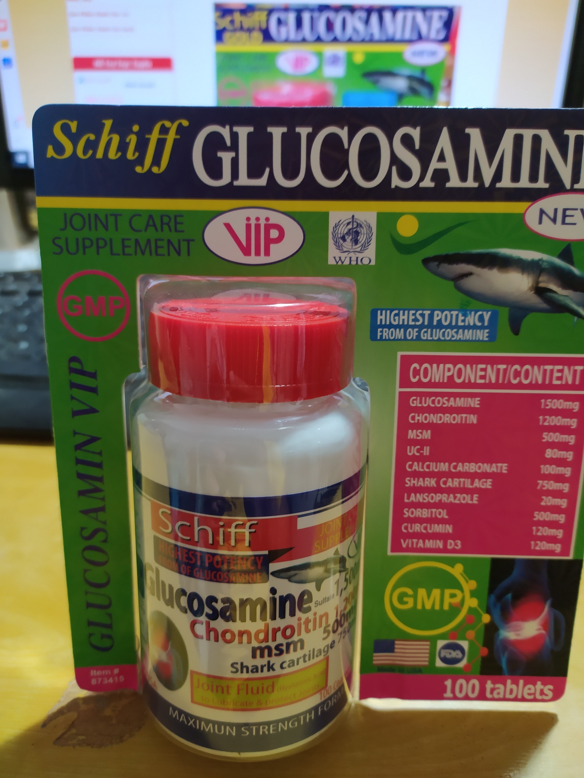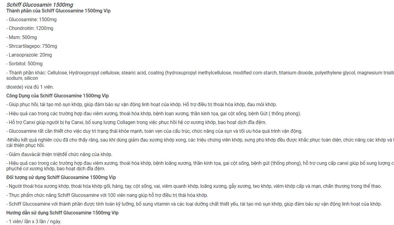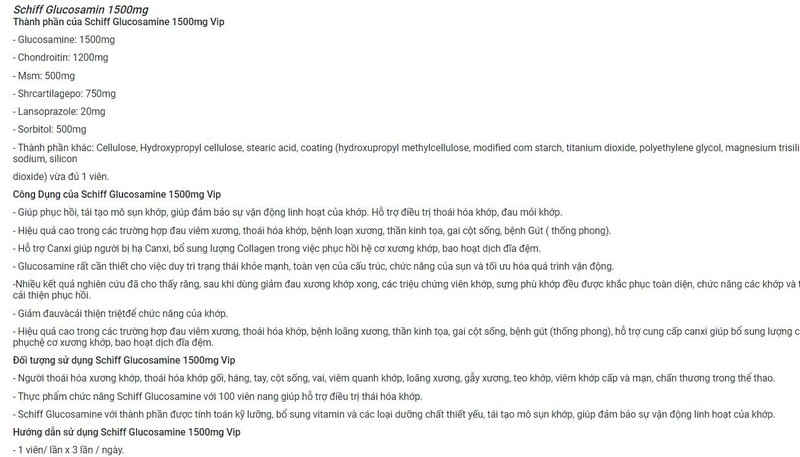 Glucosamin 1500 mgThành phần chính: Glucosamine 1500 mg, Chondroitin 1200 mg, Shark Cartilage 750 mg, MSM 500 mg, Vitamin D3 120 mg, Sorbitol 500 185.000đ