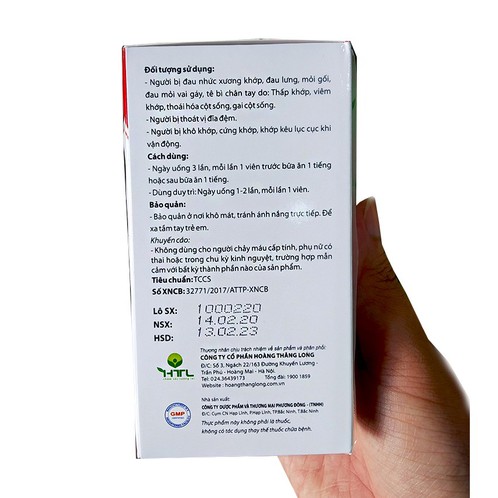 2. Đối tượng sử dụng- Người bị sưng, nóng, đỏ, đau các khớp: Bả vai, đầu gối, khuỷu tay, cổ tay, cổ chân, các đầungón tay, ngón chân- Các trường hợp bệnh thoái hóa khớp: thoái hóa đốt sống cổ, đốt sống lưng, gai đôi và vôihóa cột sống- Người bị viêm khớp, viêm đa khớp dạng thấp- Người mắc bệnh khô khớp, cứng khớp, khớp kêu lục cục khi vận động- Người Đau thần kinh tọa do thoái hóa khớp, gai đôi cột sống gây nên- Người bị đau lưng, mỏi gối, hoa mắt, chóng mặt, đau mỏi vai gáy, tê tay, chân- Người vận động ở cường độ cao, vận động viên