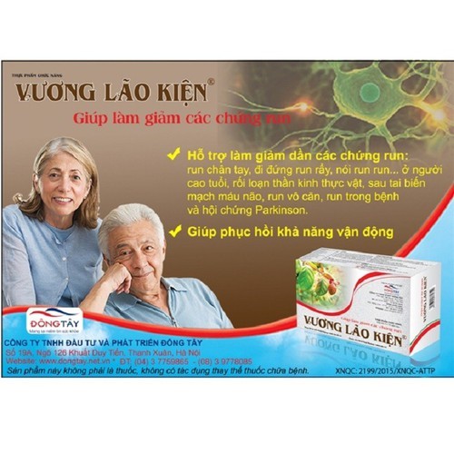 Vương Lão Kiện - Giải Pháp Cho Bệnh Run Tay, Run Chân Ở Người Cao Tuổi ✅✅✅(Chính Hãng 100%)☘️☘️☘️ Thành phần Vương Lão KiệnCao Câu đằng: 30mgCao Thiên ma: 25mgCao Hà thủ ô đỏ: 15mgCao Câu kỷ tử: 15mgMẫu lệ: 15mgCao Đinh lăng: 10mgCao Xà sàng tử: 10mgCao Nhục thung dung: 10mgAlpha lipoic acid: 10mgL-Carnitine fumarate: 10mgMagie: 4mg❤️❤️❤️ Công dụng:Giúp phục hồi khả năng vận động bình thường của cơ thể.Hỗ trợ làm giảm dần các chứng run (run chân tay: cầm, nắm, đi đứng run rẩy; nói run run...) ở người cao tuổi, trong bệnh và hội chứng parkinson, do tai biến mạch máu não, do rối loạn thần kinh thực vật, run vô căn.☘️☘️☘️ Hướng dẫn sử dụng:Hỗ trợ điều tri các chứng run: 2 -4 viên/lần x 2 lần/ngày.Giúp tăng cường sức khỏe toàn trạng và duy trì khả năng vận động bình thường của cơ thể: 1-3 viên/lần x 2 lần/ngày. Nên uống trước bữa ăn 30 phút hoặc sau khi ăn 1 giờ.Nên sử dụng theo đợt liên tục từ 3 – 6 tháng để có kết quả tốt nhất.Bảo quản: Để nơi khô mát, tránh ánh sáng.Quy cách đóng gói: Hộp 3 vỉ x 10 viên nén. Hạn sử dụng: 36 tháng.Đăng ký: 00168/2018/ATTP-XNCB