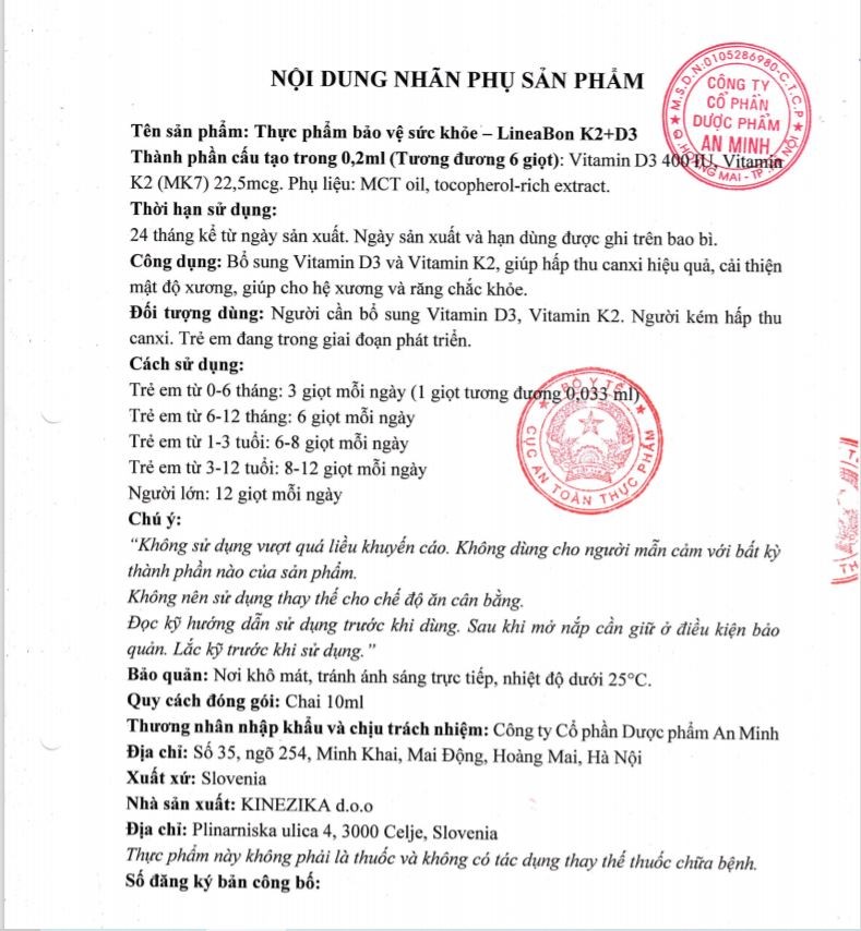 LineaBon K2+D3 - Bổ sung vitamin K2, D3. Tăng cường hấp thu canxi Quy Cách: Chai 10 mlTHÀNH PHẦN Thành phần trong 0,2ml (tươn