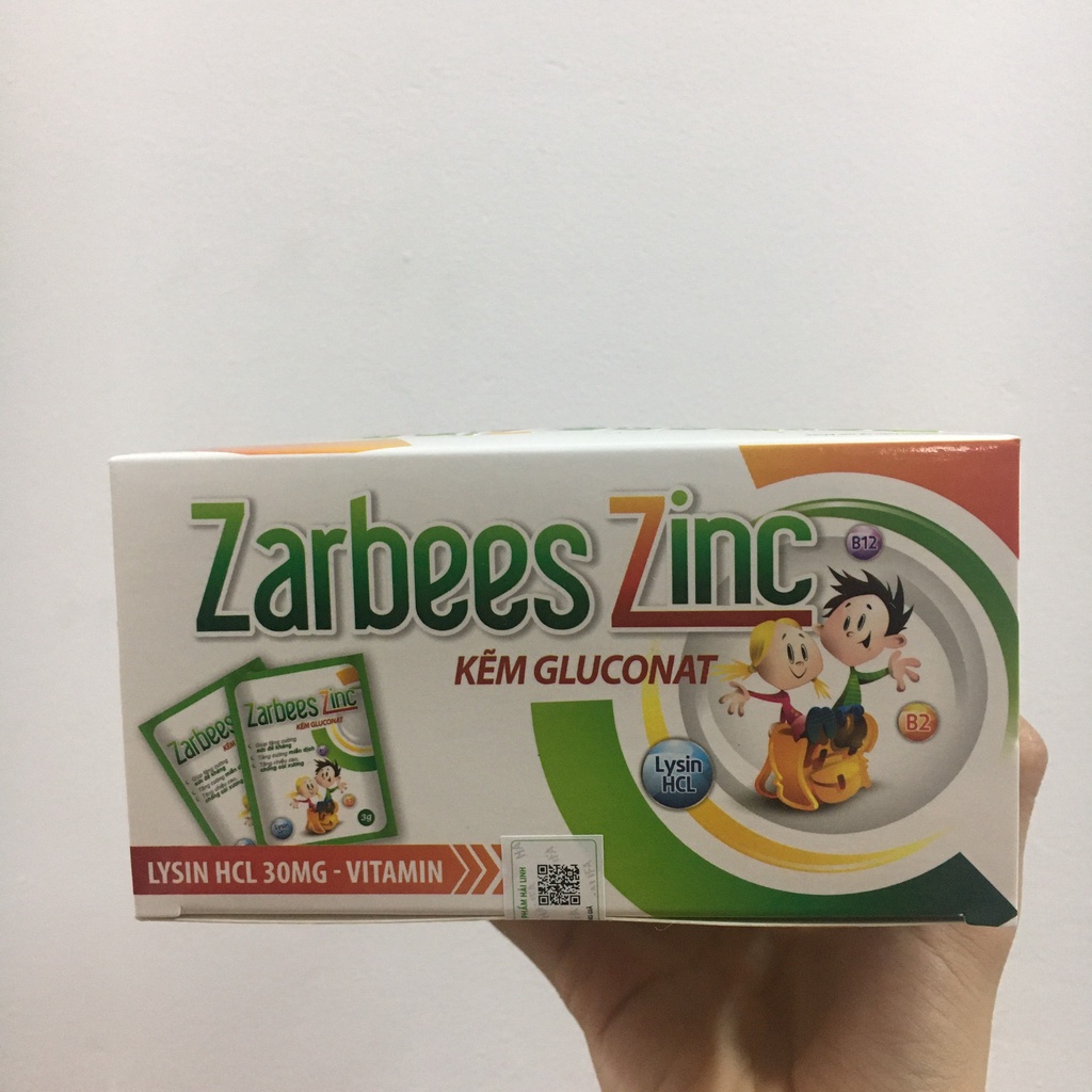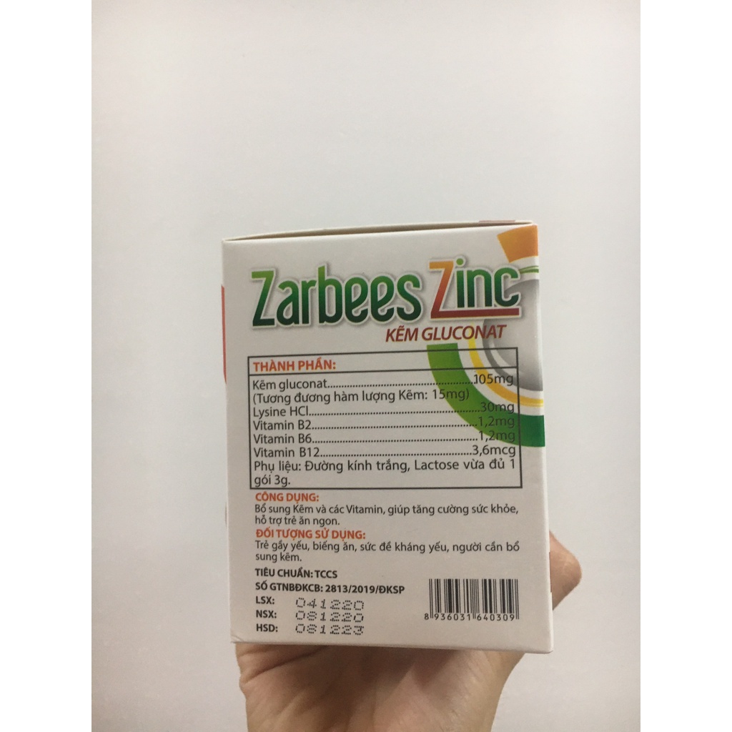 Zarbees Zinc bổ sung kẽm, hỗ trợ ăn ngon, tăng cường sức khỏe, đề kháng, miễn dịch chống còi xươngSáng phẩm không phải là thuốc không thể thay thế cho thuốc phòng bệnh THÀNH PHẦN:Lysin: ........................................ Kẽm .....Vitamin B2: ......................................Vitamin B6:.................................... Vitamin B12:....................................Thành phần khác: đủ 1gói 3gCÔNG DỤNG: Bổ sung Acid amin (Lysin, Taurin), khoáng chất và các vitamin cần thiết giúp kích thích ăn ngon, tằn cường hấp thu dưỡng chất, đặc biệt ở trẻ còi xương, suy dinh dưỡng, biếng ăn, trẻ hay ốm vặt, gầy yếu, giúp tăng cường phát triển về trí tuệ và thể chất ở trẻ em.Tăng cường sức đề kháng, miễn dịch Trẻ 2-4 tuổi dùng 2gói/ngày chia đều 2lần5tuổi trở lên 3gói/ngày Người lớn 4gói/ngày