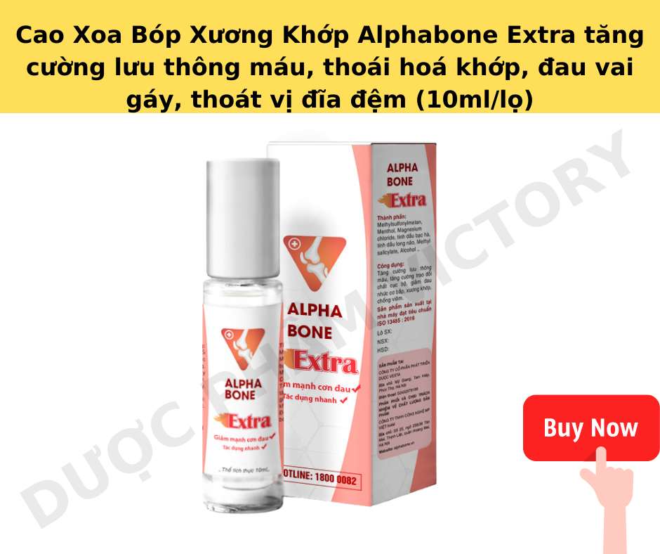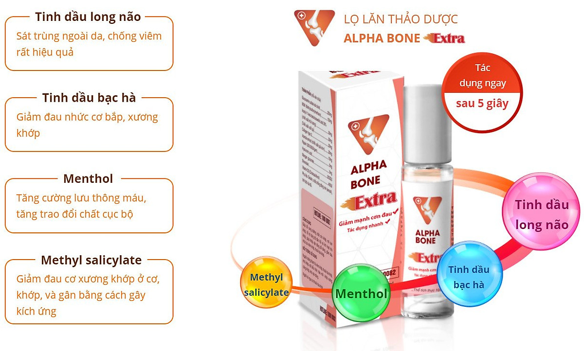 Dầu nóng xoa bóp, cao xoa bóp xương khớp Alpha Bone Extra, dầu lăn massage cổ vai gáy, thoát vị đĩa đệm (1 lọ/10ml)✅Alphabone Extra là dầu lăn đầu tiên xuất hiện ở Việt Nam. Đây là sản phẩm được bào chế từ các thảo dược quý từ tự nhiên như tinh dầu bạc hà, long não,…. được nhập khẩu từ Anh Quốc, Ấn Độ. ✅Không giống như các sản phẩm dầu nóng xoa bóp, cao xoa bóp, dầu lăn xương khớp khác, Alphabone Extra ngoài công dụng giảm mạnh các cơn đau do thoái hóa khớp, thoát vị đĩa đệm, còn có thể sử dụng cho các cơn đau cơ bắp do vận động thể thao, các cơn đau đầu, đau bụng và côn trùng cắn. ✅Dầu xoa bópAlphabone Extra được sản xuất bằng công nghệ hiện đại, đạt tiêu chuẩn quốc tế GMP, đã được Bộ Y tế kiểm định nghiêm ngặt và cấp phép sử dụng.