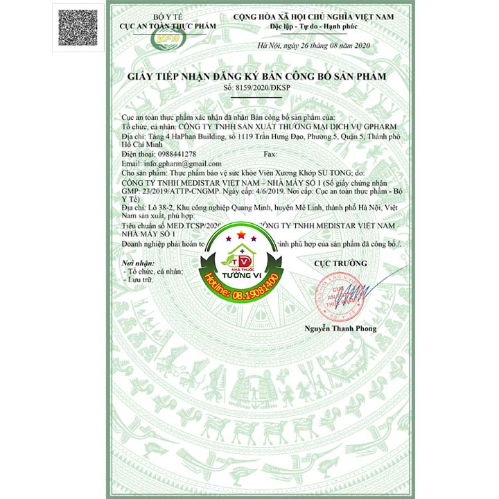 💓💓 [CHÍNH HÃNG] VIÊN XƯƠNG KHỚP SU TONG GPHARM – GIÚP GIẢM ĐAU KHỚP, VIÊM THẤP KHỚP, TÊ MỎI VAI GÁY🌻🌻🌻 CHÀO MỪNG QUÝ KHÁCH ĐẾN VỚI NHÀ THUỐC TƯỜNG VI 🌻🌻🌻🌈 🌈 Kính mời quý khách Chat/Inbox với shop hoặc gọi 081.9081.400 để tư vấn miễn phí về sản phẩm và cách mua hàng nhé 💓💎 ĐỐI TƯỢNG SỬ DỤNG VIÊN XƯƠNG KHỚP SU TONG: Người bị phong thấp, thấp khớp gây đau nhức, tê mỏi chân tay, đau vai gáy, đau lưng mỏi gối.Người bị viêm khớp, viêm khớp dạng thấp.Người lớn tuổi đi lại yếu sứcNgười bị sưng đỏ các khớp do bệnh Gout💎 HƯỚNG DẪN SỬ DỤNG VIÊN XƯƠNG KHỚP SU TONG: Liều duy trì sức khỏe: Ngày uống 2 lần, mỗi lần 3 viên. (Trước bữa ăn 30 phút hoặc sau khi ăn 1 giờLiều hỗ trợ: Ngày uống 3 lần, mỗi lần 3 viên. (Trước bữa ăn 30 phút hoặc sau khi ăn 1 giờ)Mỗi đợt nên dùng từ 2-3 tháng và có thể tiếp tục sử dụng cho đến khi đạt kết quả tốt nhất. 💎 HẠN SỬ DỤNG: Vui lòng xem trên bao bì sản phẩm!💎 Xuất xứ:Việt Nam💎Sản xuất: CÔNG TY TNHH GIAI CẢNH💎 Địa chỉ: 295 Nguyễn Trãi, Phường 7, Quận 5, TPHCMSẢN PHẨM NÀY KHÔNG PHẢI LÀ THUỐC, KHÔNG CÓ TÁC DỤNG THAY THẾ THUỐC CHỮA BỆNH!!!==========================================================================💓💓 NHÀ THUỐC TƯỜNG VI CAM KẾT 💓💓🎯 Tất cả sản phẩm luôn chính hãng 100%, nguồn gốc xuất xứ rõ ràng, nói không với hàng giả, hàng nhái, hàng kém chất lượng.🎯 Sản phẩm luôn có hạn sử dụng dài🎯 Luôn tư vấn tận tâm, nhiệt tình. 🎯 Giá cả luôn hợp lý, cạnh tranh, tiết kiệm cho Quý khách hàng🌞 Sẵn sàng đổi trả hoặc hoàn lại tiền cho khách trong 48h kể từ ngày nhận hàng nếu sản phẩm lỗi hoặc hư hỏng trong quá trình vận chuyển ❤#nhathuoctuongvi #tuongviphuyen #tuongvipharmacy #tuongvi