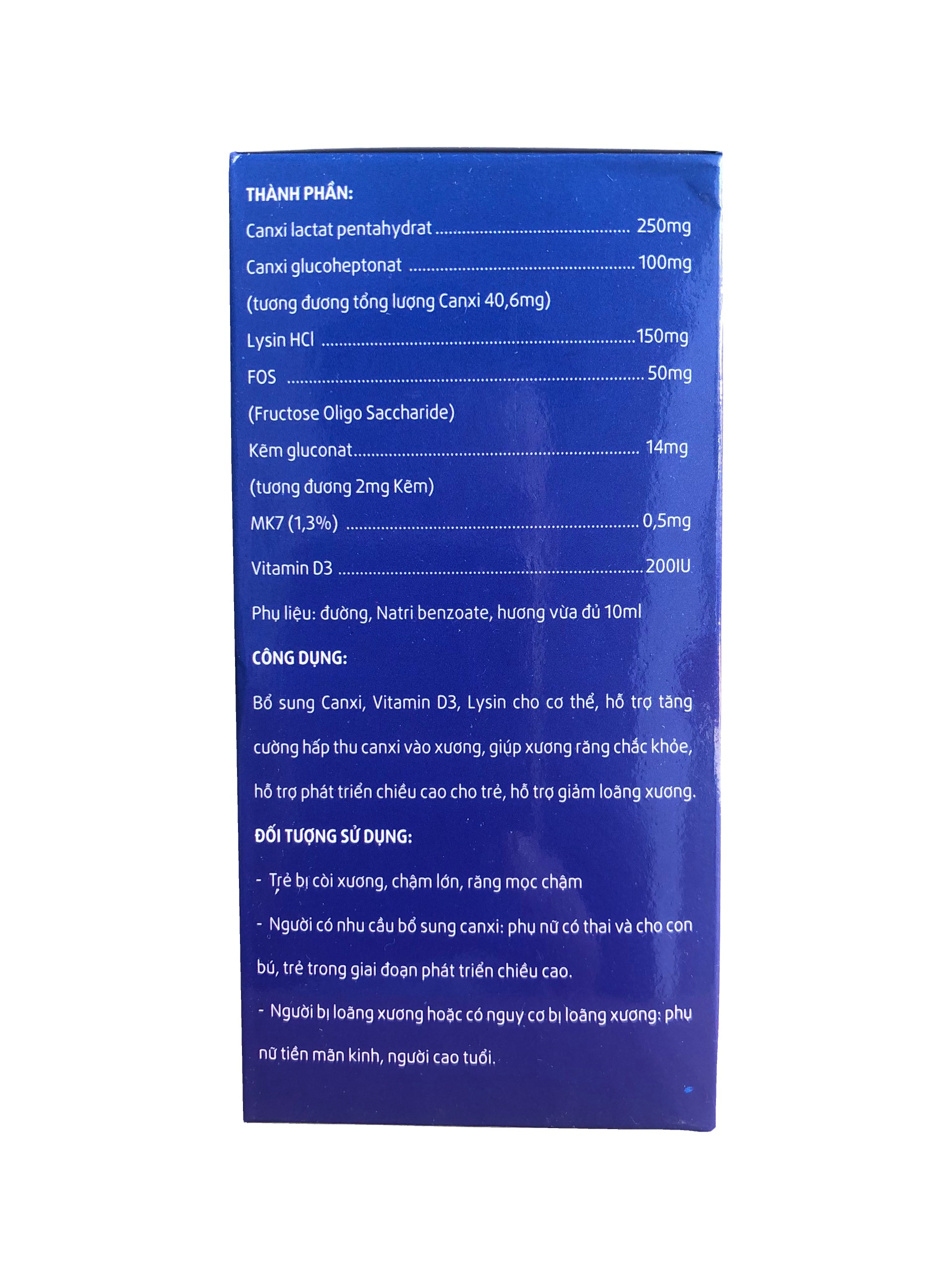 Bổ sung Canxi, Vitamin D3, Lysin cho cơ thể, hỗ trợ tăng cường hấp thu canxi vào xương , giúp xương chắc khỏe, hỗ trợ phát triển chiều cao cho trẻ, hỗ trợ giảm loãng xương.