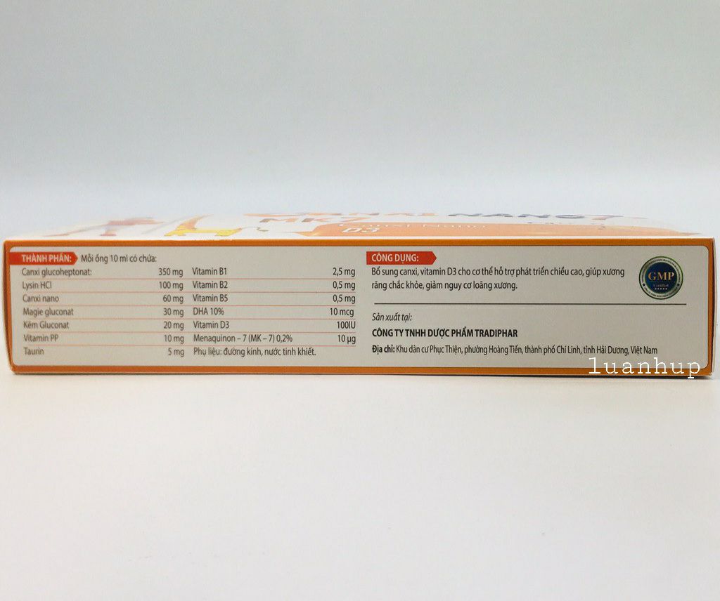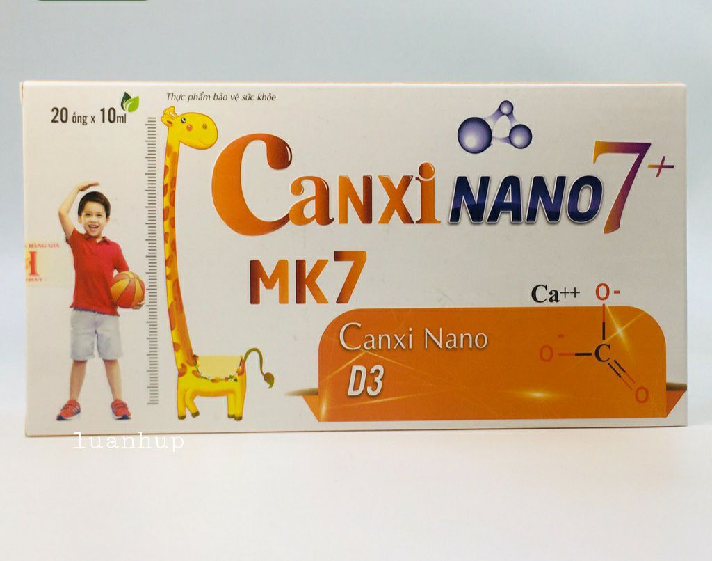 Canxi có vai trò quan trọng trong sự hình thành và phát triển của hệ xương khớp, răng của trẻ, đồng thời còn có nhiệm vụ nhất định với hệ thần kinh, miễn dịch, cơ bắp và nhiều chức năng khác của cơ thể. Khi kết hợp với vitamin D, canxi được bổ sung đủ sẽ giúp hạn chế tình trạng còi xương, suy dinh dưỡng ở trẻDo vậy, nếu trẻ bị thiếu hụt canxi, sẽ dẫn đến tình trạng khung xương mềm, xương có thể bị biến dạng, chất lượng răng kém, trẻ chậm chạp, dễ bị còi xương, suy dinh dưỡng hơn bạn bè cùng lứa tuổi, dễ gặp những triệu chứng như: chán ăn, buồn nôn, mệt mỏi, mất ngủ,…Tuy phần lớn các bậc cha mẹ đều nghĩ đã cũng cấp đầy đủ canxi cho con qua các bữa ăn trong ngày, nhưng trên thực tế, lượng canxi được bổ sung qua chế độ ăn chỉ chiếm khoảng 50% nhu cầu cơ thể. Vì vậy, các bậc cha mẹ cần phải nắm được cách cho trẻ uống bổ sung canxi đúng cách, để tạo tiền đề cho trẻ phát triển tốt nhất.Cha mẹ có thể bổ sung canxi cho trẻ qua các thực phẩm giàu canxi hàng ngày như: sữa, sữa chua, phô mai, cá hồi, đậu phụ, ngũ cốc, rau có màu xanh sậm, hải sản, tảo biển, các loại trái cây mọng...Đồng thời, cha mẹ cần hạn chế sử dụng các loại thực phẩm ngăn cản sự hấp thụ canxi của cơ thể như: chocolate, các loại quả mọng họ berry, nho, khoai lang, cà tím. 👉 Ngoài ra có thể dùng ngay sản phẩm Canxi Nano 7+ bổ sung canxi, giúp xương chắc khỏe và hỗ trợ tăng chiều cao cho trẻ.✅ THÀNH PHẦN: - Canxi glucoheptonat: 350mg- Lysin Hcl: 100mg- Canxi nano: 60mg- Magie gluconat: 30mg- Kẽm gluconat: 20mg- Vitamin PP: 10mg- Taurin: 5mg- Vitamin B1: 2,5mg- Vitamin B2: 2,5mg- Vitamin B5: 0,5mg- DHA 10%: 10mcg- Vitamin D3: 100IU- Menaquinon -7 ( MK 7) 0,2%: 10ug🔑CÔNG DỤNG: Bổ sung canxi, vitamin D3 cho cơ thể hỗ trợ sự phát triển chiều cao. Giúp xương, răng chắc khỏe, giảm nguy cơ loãng xương.------💊ĐỐI TƯỢNG SỬ DỤNG:👉 Người có nhu cầu canxi cao: trẻ còi xương, chậm lớn hoặc đang độ tuổi phát triển.👉 Người loãng xương hoặc có nguy cơ loãng xương: phụ nữ mãn kinh, tiền mãn kinh, người cao tuổi.------💊CÁCH DÙNG VÀ LIỀU DÙNG:👉Trẻ em 2-> 9 tuổi: 10ml/lần x ngày 2 lần;👉 Trẻ em trên 9 tuổi -> người lớn: 10ml/lần x ngày 3 lần.Bảo quản: Nơi khô ráo, thoáng mát, tránh ánh nắng trực tiếp.----------⚠️ Sản phẩm đã được chứng nhận chất lượng, cấp phép lưu hành (do Cục ATVSTP cấp) và dán tem chống hàng giả. Sản phẩm hiện được bán rộng rãi tại các nhà thuốc trên toàn quốc;