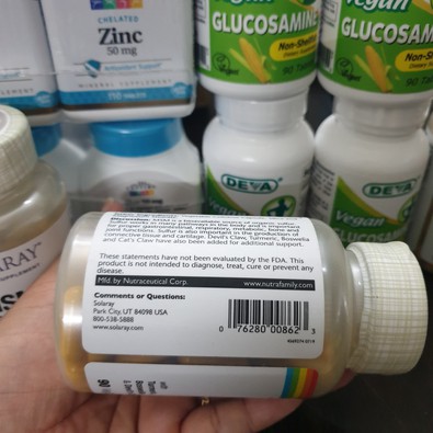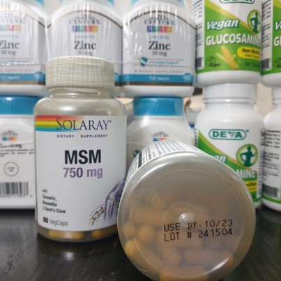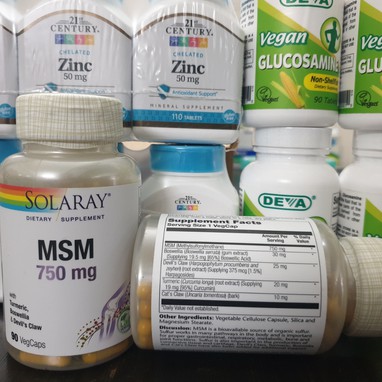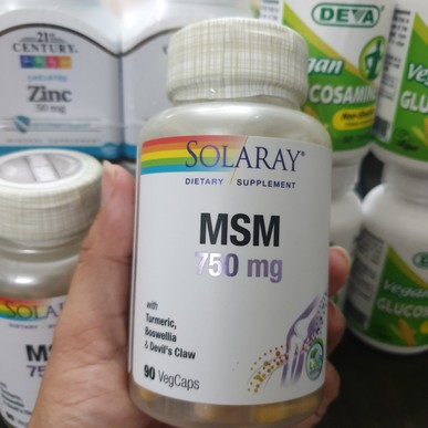 - Các bệnh về xương khớp tuy không gây nguy hiểm đến tính mạng, nhưng để lại rất nhiều phiền toái. Các cơn đau nhức khớp làm người bệnh khó hoạt động, thậm chí chỉ cần cúi nhẹ cũng cảm thấy đau lưng, sút lưng. Khớp gối thường xuyên trong tình trạng sưng đỏ, đi lại khó khăn. Những người có tuổi thường hay mắc các bệnh về xương khớp hơn người trẻ tuổi. Cơ thể già đi dẫn đến các khớp xương bị thoái hóa, không còn dẻo dai như ban đầu. Solaray. Msm 750 mg hỗ trợ sự phát triển của sụn khớp, ngăn ngừa cơn đau khớp. Chất MSM (methyl sulfonyl methane) được phát hiện với những tác dụng tốt cho xương khớp. Nó thường được sử dụng làm thực phẩm chức năng bổ trợ bệnh viêm khớp. Solaray, Msm 750 mg cải thiện dần các mô thoái hóa trong khớp, làm giảm đau khớp từng ngày.