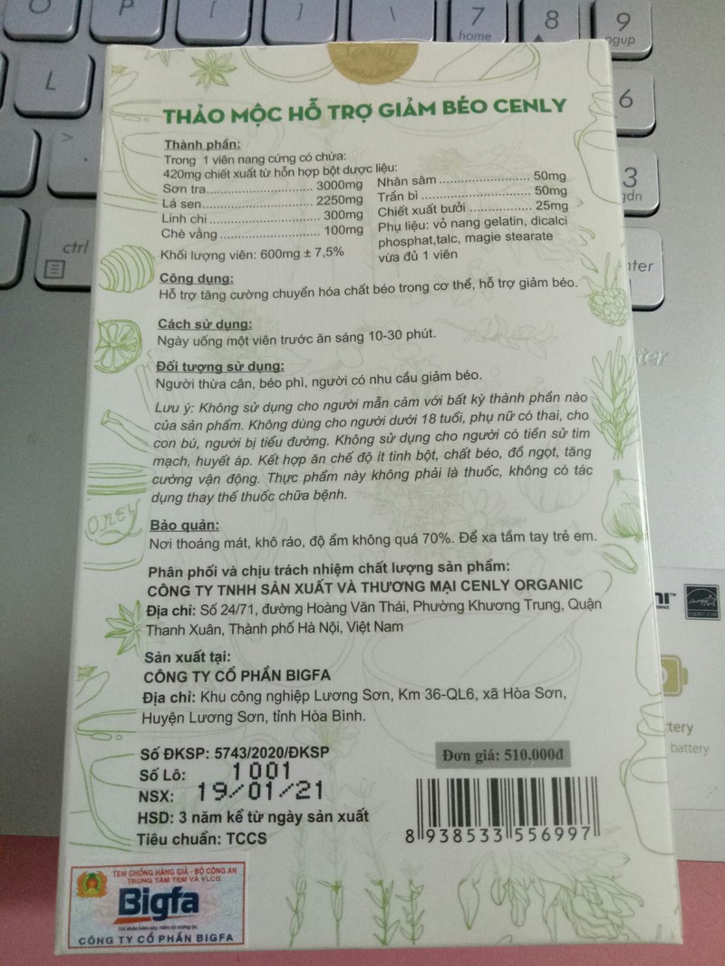 - Giảm Cân Cenly Gia Truyền được sản xuất độc quyền tại công ty TNHH Cenly Organic với công dụng làm giảm cơn thèm ăn, tăng quá trình trao đổi chất trong cơ thể. Từ đó kiểm soát cân nặng, giảm mỡ dư thừa và thon gọn vóc dáng. Giảm Cân Cenly Gia Truyề