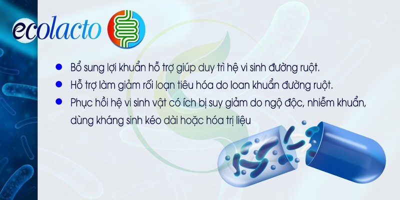 Viên uống men vi sinh Ecolacto là những vi khuẩn có lợi (lợi khuẩn) giúp cân bằng sự đảo lộn về tạp khuẩn ở đường ruột. Khi những vi khuẩn có hại sản sinh quá nhiều trong đường ruột, sẽ khiến đường ruột bị nhiễm trùng, gây ra một số triệu chứng như tiêu chảy, trướng bụng, khó tiêu, đi ngoài phân sống,… Các lợi khuẩn được bổ sung sẽ giúp cân bằng tạp khuẩn trong đường ruột, làm cải thiện những triệu chứng bệnh lý trên.