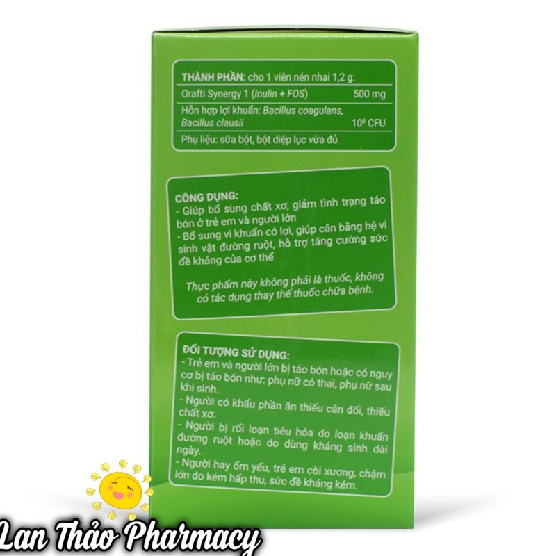 Thành phần: Cho 1 viên nén nhai 1,2 g:Orafti Synergy 1 (Inulin + FOS): 500 mgHỗn hợp lợi khuẩn: Bacillus coagulans, Bacillus clausii: 10^8 CFUPhụ liệu: sữa bột, bột diệp lục vừa đủ