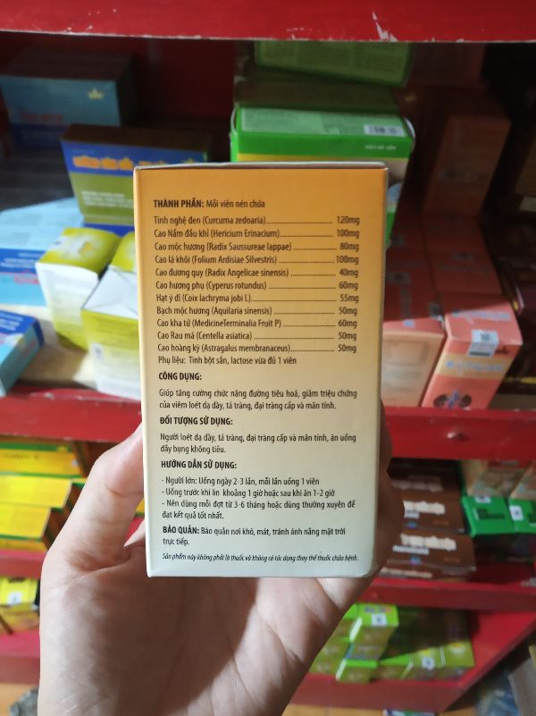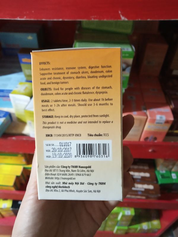1. THÀNH PHẦNTinh nghệ đen, Cao Nấm đầu khỉ, Cao mộc hương, Cao lá khôi, Cao đương quy, Cao hương phụ, Hạt ý dĩ, Bạch mộc hương, Cao kha tử, Cao Rau má, Cao hoàng kỳ2. CÔNG DỤNG NỔI TRỘI CỦA BẢO HÒA VIÊN NANOGOLDGiúp tăng cường chức năng đường tiêu hoáGiảm triệu chứng của: ->> Viêm loét dạ dày, tá tràng ->> Đại tràng cấp và mãn tính. 3. NHỮNG ĐỐI TƯỢNG NÊN SỬ DỤNG BẢO HÒA VIÊN NANOGOLDNgười loét dạ dày, tá tràngNgười đại tràng cấp và mãn tínhNgười ăn uống đầy bụng không tiêu. 4. CÁCH SỬ DỤNG HIỆU QUẢ BẢO HÒA VIÊN NANOGOLD Người lớn: Uống ngày 2-3 lần, mỗi lần uống 1 viênUống trước khi ăn khoảng 1 giờ hoặc sau khi ăn 1 -2 giờNên dùng mỗi đợt từ 3-6 tháng hoặc dùng thường xuyên để đạt kết quả tốt nhất 6. BẢO QUẢNBảo quản nơi khô, mát, tránh ánh nắng mặt trời trực tiếp(Sản phẩm này không phải là thuốc và không có tác dụng thay thế thuốc chữa bệnh)