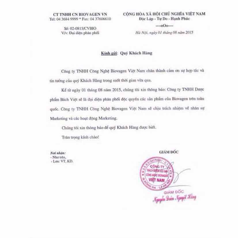 - Vỏ hộp có in logo BiovaGen (công ty phân phối độc quyền chính thức tại thị trường Việt Nam).