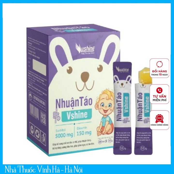 Nhuận Táo Vshine - Giải Pháp Vàng Cho Đường Ruột Khoẻ Mạnhg DụngGiúp bổ sung chất xơ cho cơ thể, giúp nhuận tràng. Hỗ trợ tăng cường tiêu hoá, giúp giảm nguy cơ táo bón.Thành PhầnThành phần cấu tạo cho 12g:Inulin: 1000mgPsyllium Husk Extract (Chiết xuất vỏ hạt mã đề): 300mgDiosmin: 150mgMethylcellulose: 100mgFOS: 20mgPhụ liệu: Sucralose, locus bean gum, konjac, aspartam, acid citric, kali sorbate, natri benzoat,hương tổng hợp, màu thực phẩm, nước tinh khiết, sorbitol vừa đủ 12g.Đối TượngTrẻ em và người lớn có chế độ ăn ít xơ, người có nguy cơ bị táo bón, người bị táo bón, đầy bụng, khó tiêu, người có nguy cơ bị trĩ do táo bón.Cách DùngTrẻ em từ 2-9 tuổi: 12g/ lần/ ngàyTrẻ em từ 9 tuổi và người lớn, phụ nữ có thai và cho con bú: 12g/ lần x 2 lần/ ngày.Lưu ý: Sản phẩm này không phải là thuốc, không có tác dụng thay thế thuốc Nhà thuốc Vĩnh Hà - Hà Nội - chuyên cấp các sản phẩm bổ sung cho sức khỏe chính hãng, date xa, đảm bảo chất lượng. Hãy FOLLOW shop để nhận Voucher ưu đãi của shopThành Phần ---------------------------Được tư vấn nhiệt tình.Khách hàng cũ: Liên tục được cập nhật những ưu đãi mới.Luôn có đa dạng Voucher trong shop cho các bạn lựa chọn----------------------------Shop CAM KẾT1. Sản phẩm giống mô tả. 2. Sản phẩm được kiểm tra kĩ càng, cẩn thận và tư vấn nhiệt tình trước khi gói hàng giao cho Quý Khách.3. Hàng có sẵn, giao hàng ngay khi nhận được đơn.4.Shop sẽ cố gắng trả lời hết những thắc mắc xoay quanh sản phẩm nhé.5. Hỗ trợ đổi trả theo quy định của Sàn.----------------------------------------Shop xin cảm ơn bạn đã tin tưởng và chọn sản phẩm của Shop.Hy vọng bạn hài lòng với sản phẩm của Shop và đừng quên giới thiệu bạn bè của bạn nhé!Xin trân thành cảm ơn! Cảm ơn !***Chú ý : " Sản phẩm ko phải là thuốc và không có tác dụng thay thế thuốc "#nhathuocvinhhahanoi#nhathuocvinhha# #dha #xuong_chac_khoe #canxi #loang_xuong #coi_xuong
