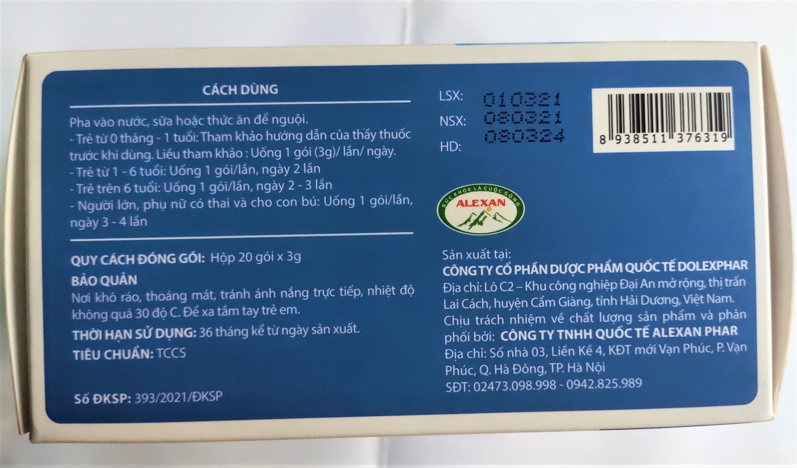 - Trẻ từ 0 tháng – 1 tuổi: tham khảo hướng dẫn của thầy thuốc trước khidùng. Liều tham hảo 1 gói (3g)/lần/ngày.