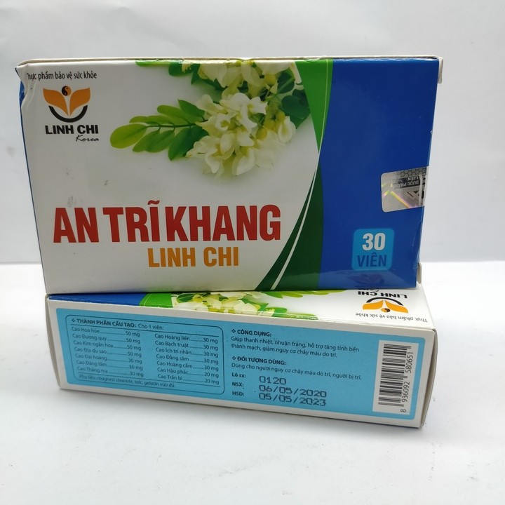 Công dụngTPCN An Trĩ Khang Linh Chi có công dụng giúp thanh nhiệt, nhuận tràng, tăng tính bền thành mao mạch, ngăn ngừa xuất huyết dưới da, niêm mạc.Thành phầnTPCN An Trĩ Khang Linh Chi được bào chế từ một số loại thảo dược như: Cao địa du sao, cao đương quy, cao đại hoàng, cao đăng tâm, cao thăng ma, cao kim ngân hoa, cao hoa hòe, cao hoàng liên, cao bạch truật, cao ích trí nhân, cao đẳng sâm, cao hoàng cầm, cao hậu phác, cao trần bì. Ngoài ra, còn một số thành phần khác như: Magnesium stearate, talc vừa đủ.Liều dùngĐối với người lớn: 2-3 viên/lần x 3 lần/ngàyTrẻ em: 1-2 viên/lần x 3 lần/ngàyMỗi đợt nên dùng 2 tháng để có kết quả tốt nhấtChỉ định TPCN An Trĩ Khang Linh Chi dùng cho người có nguy cơ xuất huyết dưới da, niêm mạc, người bị trĩ.Chống chỉ địnhSản phẩm không dùng cho phụ nữ có thai hoặc đang cho con búKhông dùng cho trẻ nhỏ dưới 10 tuổiSản phẩm không dùng cho người huyết áp caoKhông nên sử dụng trong thời gian dùng nhiều thức ăn cay nóng như ớt, hạt tiêu, rượu, cà phêKhông dùng cho người mẩn cảm với bất kì thành phần nào của thuốcChất liệu bao bìSản phẩm được đựng trong ống nhựa đảm bảo an toàn theo quy định của Bộ y tế. Lọ nhựa, nắp nhựa, màng nhôm, màu trắng phù hợp với tiêu chuẩn bao bì dùng cho thực phẩm.Lưu ý:An Trĩ Khang Linh Chi là TPCN không phải là thuốc. Không có tác dụng thay thế thuốc chư.abenhĐọc kĩ hướng dẫn sử dụng trước khi dùng TPCNKhi sử dụng thuốc nên có sự hướng dẫn của bác sĩ