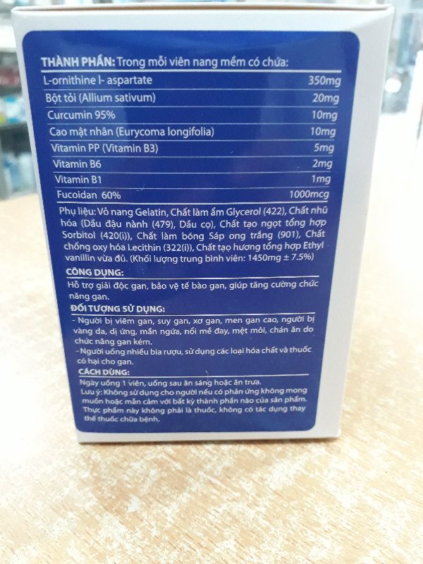 Công dụng: hỗ trợ giải độc gan, bảo vệ tế bào gan, giúp tăng cường chức năng gan.Đối tượng sử dụng:_ Người bị viêm gan, xơ gan, suy gan, men gan cao, người bị vàng da, dị ứng mẩn ngứa, nổi mề đay, mệt mỏi chán ăn do chức năng gan kém._ Người uống nhiều rượubia, sử dụng các loại hóachất và thuốccó hại cho gan.Cách dùng:Ngày uống 1 viên, uống sau ăn sáng hoặc ăn trưa. Thương nhân chịu trách nhiệm về chất lượng sản phẩm và phân phối : công ty Cổ phần Tập đoàn dược phẩm Sun