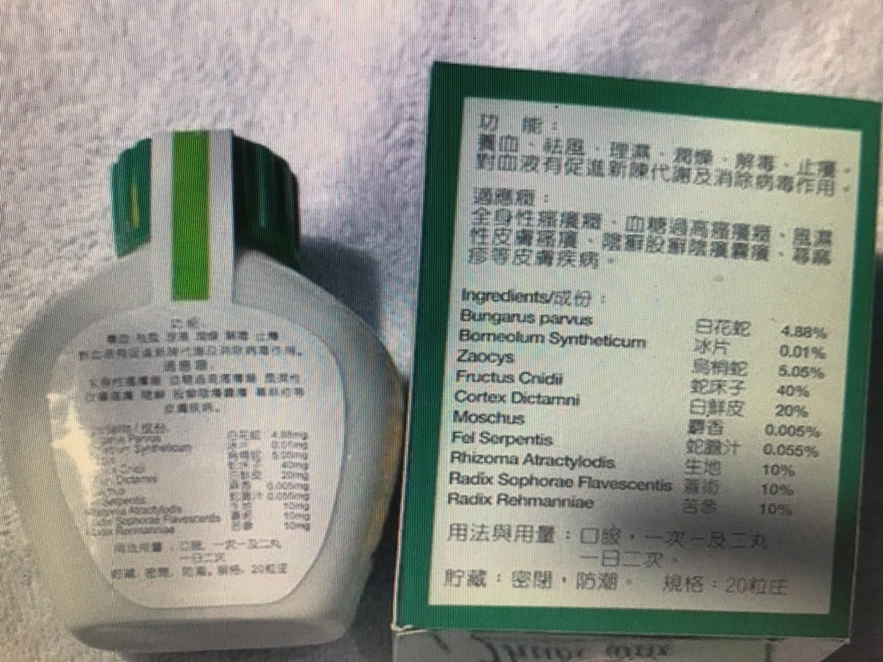 Thành phần: HOA XÀ CHỈ DƯỠNG HOÀN - Snake Itch Removing Pills gồm: