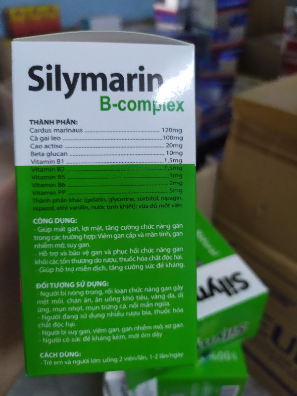 Sản phẩm này không phải là thuốc -và không có tác dụng thế được thuốc chữa bệnh THÀNH PHẦN CẤU TẠOChiết xuất kế sữa (Cardus marinanus)…………………Cao Cà gai leo……………………………Cao Actiso……………………………60 mgThymomodulin……………………….30 mgVitamin B1…………………………….1.5 mgVitamin B2…………………………….1.5 mgVitamin B5…………………………….6 mgVitamin B6…………………………….2 mgVitamin PP…………………………….6 mgThành phần khác: Gelatin, glycerine, sorbitol, nipagin, nipazol, ethylvanilin, nước tinh khiết vừa đủ 3 viên.CÔNG DỤNGGiúp mát gan, lợi mật, tăng cường chức năng gan trong các trường hợp: viêm gancấp và mãn tính, gan nhiễm mỡ.Hỗ trợ bảo vệ tế bào gan và phục hồi chức năng gan khỏi các tổn thương do rưu, thuốc, hóa chất độc với gan.ĐỐI TƯỢNGNgười bị nóng trong, rối loạn chức năng gan gây mệt mỏi, chán ăn, ăn uống khó tiêu, vàng da, dị ứng, gan nhiễm mỡ, men gan cao.Người đang sử dụng nhiều rưu, biiia, thuốc, hóa chất độc hại.HƯỚNG DẪN SỬ DỤNGTrẻ em trên 6 tuổi và người lớn: Uống 1 viên/ 1 lần x 3 lần/ ngày.📞Mọi chi tiết xin liên hệ: #mat-gan #bo-gan #gan #mo #silymarin #loi-mat #nong-trong-nguoi #mat #SILYMARIN