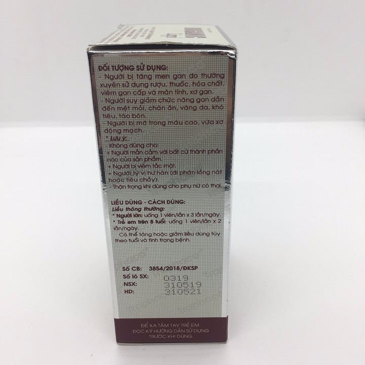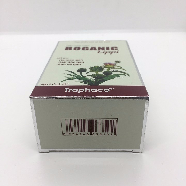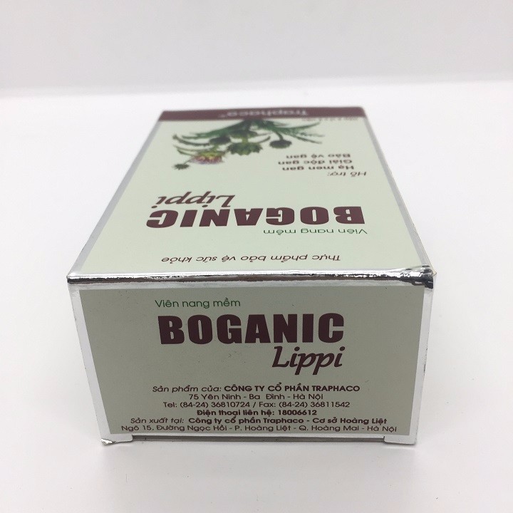 THÀNH PHẦN: Mỗi viên chứa: Cao Boganic GACP: 155,8mg (Cao khô Actiso 85mg, Cao khô Rau đắng đất 64mg, Cao khô Bìm bìm 6,8mg), Silymarin: 50mg, Vitamin B1 (Thiamin hydroclorid): 4mg, Vitamin B2 (Riboflavin): 4mg, Vitamin B6 (Pyridoxin hydroclorid): 4mg, Vitamin B5 (Calci pantothenat): 8mg, Các thành phần nguyên phụ liệu khác: Dầu đậu nành, Gelatin, Palm oil, Sorbitol, Glycerin, Lecithin, Sáp ong trắng, Nước tinh khiết, Colloidal silicon dioxid, Oxyd sắt đỏ, Titan dioxyd, Quinoline yellow, Methylparaben, Oxyd sắt nâu, Sunset yellow, Ethyl vanillin, Propylparaben.....vđ. Viên nang mềm Boganic Lippi có công thức là sự kết hợp độc đáo của cao Boganic GACP được tinh chiết từ Actiso, Rau đắng đất, Bìm bìm đạt chuẩn theo thực hành tốt trồng trọt và thu hái dược liệu theo khuyến cáo của tổ chức y tế thế giới (GACP-WHO) và Sylimarin cùng hỗn hợp các vitamin nhóm B (B1, B2, B6, B5). CÔNG DỤNG: - Giải độc gan, tăng cường chức năng gan, giúp bảo vệ tế bào gan, hỗ trợ hạ men gan. - Hỗ trợ giảm cholesterol máu, vữa xơ động mạch. ĐỐI TƯỢNG SỬ DỤNG: - Người bị tăng mên gan do thường xuyên sử dụng rượu, thuốc, tiếp xúc hóa chất gây hại cho gan, viêm gan cấp và mãn tính, xơ gan. - Người suy giảm chức năng gan dẫn đến mệt mỏi, chán ăn, vàng da, khó tiêu, táo bón. - Người bị mỡ trong máu cao, vữa xơ động mạch.Lưu ý: - Không dùng cho: + Người mẫn cảm với bất cứ thành phần nào của sản phẩm. + Người bị viêm tắc mật. + Người tỳ vị hư hàn (đi phân lỏng nát hoặc tiêu chảy). - Thận trọng khi dùng cho phụ nữ có thai. CÁCH DÙNG: Liều thông thường: * Người lớn: uống 1 viên/lần x 3 lần/ngày. * Trẻ em trên 8 tuổi: uống 1 viên/lần x 2 lần/ngày. Có thể tăng hoặc giảm liều dùng tùy theo tuổi và tình trạng bệnh.BẢO QUẢN: Nơi khô ráo, nhiệt độ không quá 30 độ C, tránh ánh nắng trực tiếp. Thực phẩm này không phải là thuốc, không có tác dụng thay thế thuốc chữa bệnh. Sản xuât tại: CÔNG TY CỔ PHẦN CÔNG NGHỆ CAO TRAPHACO, Xã Tân Quang – Huyện Văn Lâm – Tỉnh Hưng Yên. Chịu trách nhiệm và phân phối sản phẩm: CÔNG TY CỔ PHẦN TRAPHACO, Địa chỉ: 75 Yên Ninh - Ba Đình - Hà Nội.