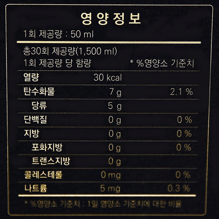 Nước tinh khiết, hỗn hợp thảo dược (thành phần rắn 70%) gồm: tinh chất hồng sâm (7mg/g, thành phần rắn 6%, nội địa) đường oligosaccharide, mật ong Hàn Quốc (nội địa). Hỗn hợp chiết xuất hovenia (thành phần rắn 12%), chiết xuất quả lê cô đặc (rắn 69%, nội địa), mật ong đậm đặc (nội địa). Tinh chất hồng sâm 6 năm tuổi (hàm lượng hồng sâm 70mg/g, thành phần rắn 60%, nội địa), taurine, vitamin C.