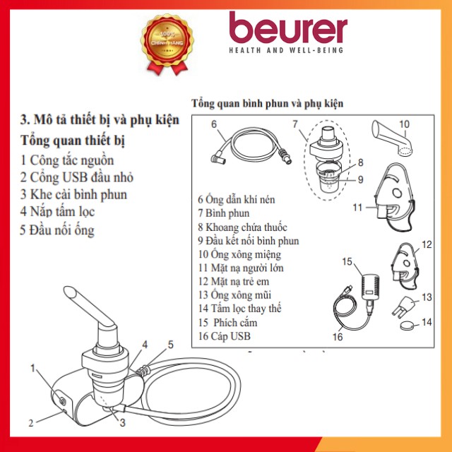 ❄ THÔNG SỐ KỸ THUẬT:- Kích thước (D x R x C): 110 x 62 x 47 mm- Trọng lượng: 176 g- Áp suất vận hành: Khoảng 0.25 tới 0.5 bar- Lượng thuốc và dung dịch sử dụng: Tối thiểu 2 ml, tối đa 6 ml- Tốc độ phun thuốc: Khoảng 0.25 ml/phút.- Áp suất âm thanh: Tối đa 45 dBA- Nguồn điện: Đầu vào: 100 – 240 V~; 50 – 60 Hz; đầu ra: 5 V ; 2 A- Vòng đời sử dụng dự tính: 400 h- Điều kiện vận hành: Nhiệt độ: +10 °C tới +40 °C, độ ẩm tương đối: 10% tới 95%, áp suất khí quyển: 700 – 1060 hPa- Điều kiện bảo quản và vận chuyển: Nhiệt độ: -20 °C tới +60 °C, độ ẩm tương đối: 10% to 95%- Áp suất khí quyển: 700 – 1060 hPa- Kích cỡ hạt (MMAD): 4.12 µm