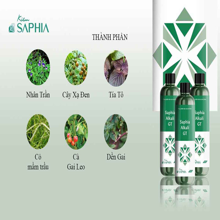 Thành phần: THỰC PHẨM CHỨC NĂNG HỒI SINH GAN THẬN KIỀM SAPHIA chiết xuất hoàn toàn từ thảo dược Việt Nam, thành phần trong 100ml gồm: Dền gai 3g, Cỏ xước 2,5g, Cà gai leo 2g, Mần trầu 2g, Tía tô 2g, Kinh giới 2g, Xạ đen 2g, Bán chi liên 2g, Lá vối 2g, Sài đất 2g, Ngải cứu 2g, Nhân trần 2g, Ngũ gia bì 2g, Hy thiêm 2g, Bạch hoa xà thiệt thảo 1,5g, Hoàn ngọc 1,5g, Diệp hạ châu 1g, Bồ công anh 1,5 g, Actiso 1g, nước tinh khiết vừa đủ.