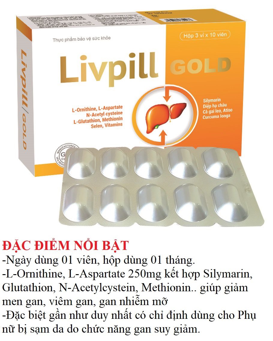 Bổ gan Livpill gold- NGÀY dùng duy nhất 01 viên.- Sự kết hợp tuyệt vời giữa L-ornithine hàm lượng cao 250mg và Silymarin ( cao cây kế sữa) 200mg, và các vitamin.