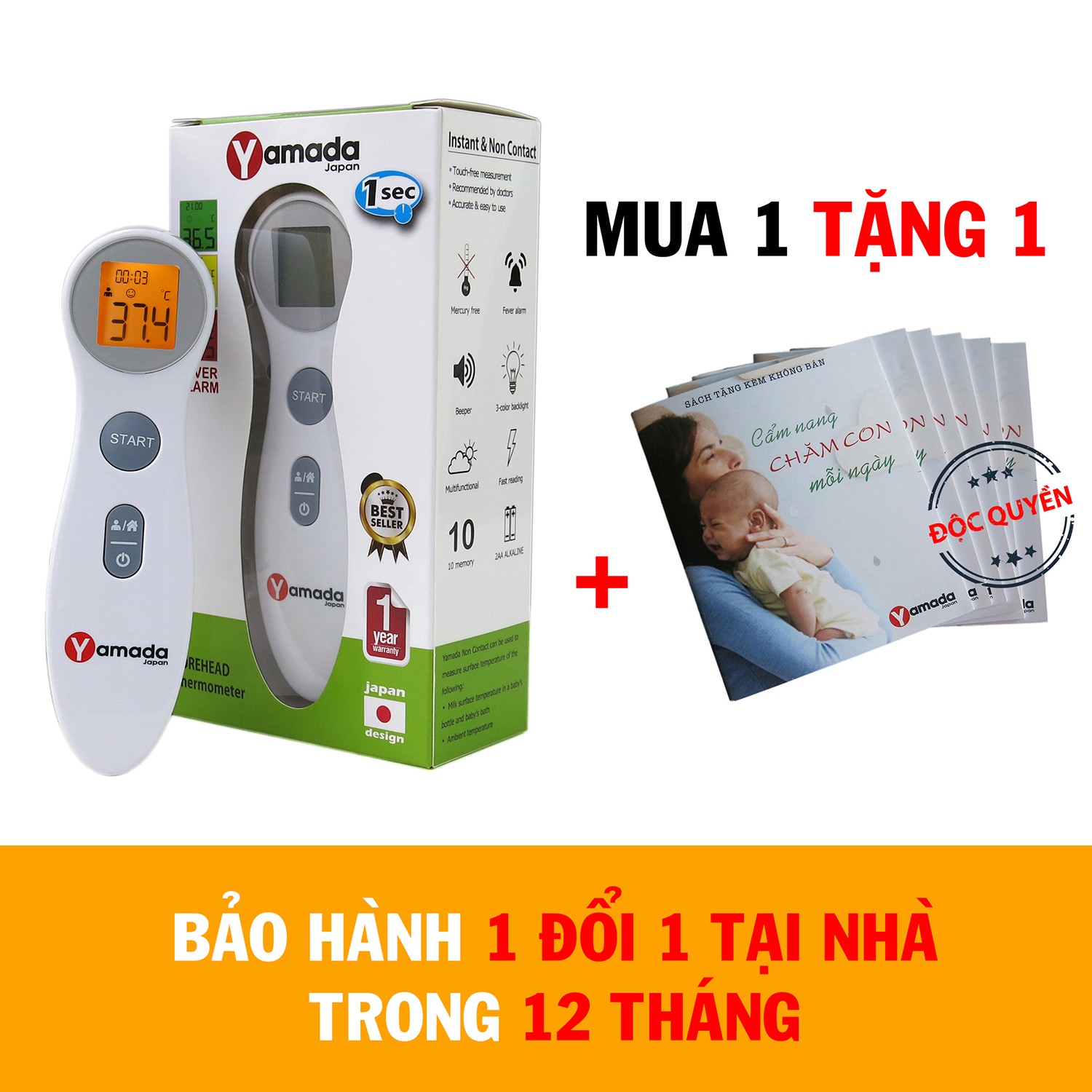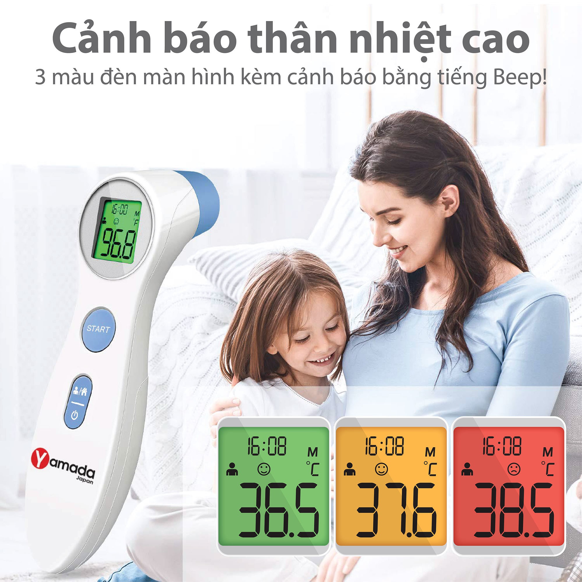 Nhiệt kế điện tử hồng ngoại đo trán Yamada - kiểm tra thân nhiệt, sữa, nước tắm trong 1 giây, cảnh báo sốt, bộ nhớ kết quả đo