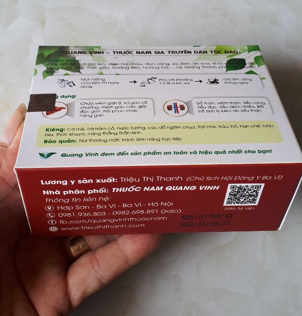 CAO GAN QUANG VINHThuốc nam gia truyền- Lương y triệu thị thanhTHÀNH PHẦN-Dây tiết dê- Cà gai leo- Diệp hạ châu- Đan vàng- Sạ đen- An coa khôi vằn- Chó đẻ răng cưa- Cây mậy gấu- Hoàng liên- Hoàng báVà những thành phần bí truyền khác.DẠNG BẢO QUẢNThuốc dạng cao cô đặcCÔNG DỤNG- chữa viêm gan B, xơ gan cổ trướng, men gan cao, giải độc gan, phục hồi chức năng gan.- Bổ thận, điều trị viêm thận, tiểu vàng tiểu đục, tiểu đêm nhiều, bồi bổ sinh lý kém do thận yếu.LIỀU LƯỢNG VÀ CÁCH DÙNG.- Cách dụngUống trước hoặc sau khi ăn 15-30 phút- Liều lượng1 lạng cao( 1 miếng cao ) chia làm 10 phần hòa với 1-2 lít nước sôi 100°C uống thay nước cả ngày.PHỤ NỮ CÓ THAI ĐANG CHO CON BÚ HOẶC TRẺ NHỎ.- Cao gan quang vinh 100% từ thảo dược thiên nhiên an toàn và lành tính không gây ra tác dụng phụ.- sử dụng được cho phụ nữ sau sinh đang cho con bú và trẻ em trên 2 tuổi.KIÊNG.Cá mè, cá trắm cỏ, nước tương. đồ ngâm chua, thịt trâu, thịt chó, thịt bò, hạn chế tối đa chất men, thịt chiên, nướng, nội tạng động vật, tránh thức khuya căng thẳng thần kinh.LƯU Ý Bệnh nhân nên chia nhỏ các bữa ăn trong ngày ra giúp cung cấp đầy đủ calo giúp gan hoạt động tốt và duy trì được mức cân bằng lành mạnh.BẢO QUẢN.Bảo quản ở nhiệt độ phòng nơi thoáng mát tránh ánh nắng trực tiếp.HẠN SỬ DỤNG2 năm kể từ ngày sản xuấtQUANG VINH TÂM SỰNhà thuốc Chúng tôi luôn nỗ lực để tìm ra những bài thuốc an toàn hiệu quả nhằm giúp tất cả các bệnh nhân điều trị bệnh, cảm ơn quý bệnh nhân đã đặt sự tin tưởng vào nhà thuốc Chúc quý bệnh nhân mau chóng khỏi bệnh- muốn có nhiều sức khỏe Hãy cho đi sức khỏe giúp đỡ nhiều người, khỏe mạnh, hạnh phúc chúcliên hệ bs 0974998467Web https://trieuthithanh.com