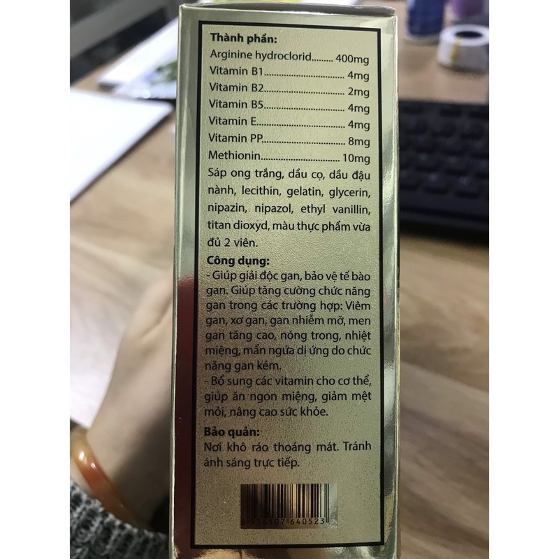 ✅ Thành Phần:Arginine hydroclorid……….400mgVitamin B1 4mgVitamin B2 2mgVitamin B5 4mgVitamin E 4mgVitamin PP 8mgMethionin 10mgSáp ong trắng, dầu cọ, dầu đậu nành, lecithin, gelatin, glycirin, nipazin, nipazol, ethyl vanillin, titan dioxyd, màu thực phẩm vừa đủ 2 viên.
