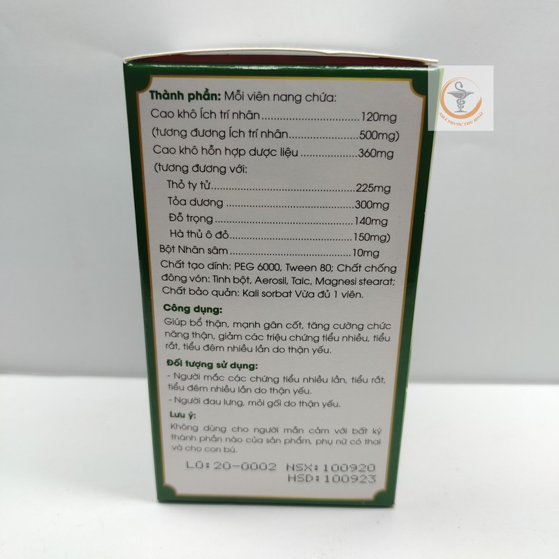 THÀNH PHẦNMỗi viên nang chứa:Cao khô Ích trí nhân 120mg(tương đương Ích trí nhân 500mg)Cao khô hỗn hợp thảo dược 360mg(tương đương với:Thỏ ty tử 225mgTỏa dương 300mgĐỗ trọng 140mgHà thủ ô đỏ 150mg)Bột Nhân sâm 10mgChất tạo dính: PEG 6000, Tween 80; Chất chống đông vón: Tinh bột, Aerosil, Talc, Magnesi stearat; Chất bảo quản: Kali sorbat Vừa đủ 1 viên.