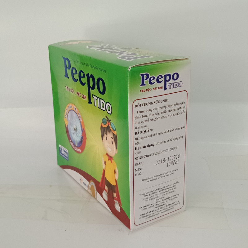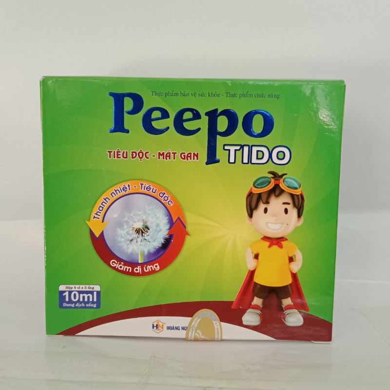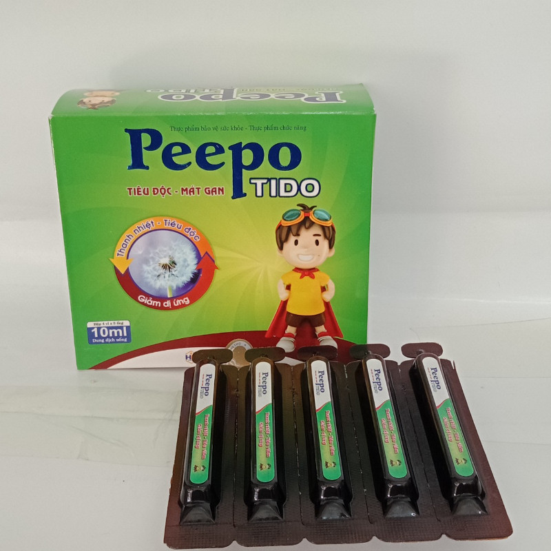 Thực phẩm chức năng tiêu độc, mát gan Peepo Tido chứa thành phần bồ công anh, sài đất, kim ngân hoa, hạ khô thảo, thổ phục giúp thanh nhiệt, giải độc, tốt trong trường hợp cơ thể bị nóng trong sinh ra nhiệt miệng, lưỡi, trẻ em rôm sẩy, mẩn ngứa, ra mồ hôi trộm, táo bón, khó tiểu tiện, giúp trẻ ăn ngon, ngủ ngon. Đồng thời Peepo Tido hỗ trợ giải độc gan, lợi mật, nhuận tràng, giảm dị ứng. Sản phẩm dùng trong các trường hợp: Mẩn ngứa, phát ban, rôm sẩy, nhiệt miệng, lưỡi, dị ứng, cơ thể nóng bứt rứt, táo bón, nước tiểu sậm màu.