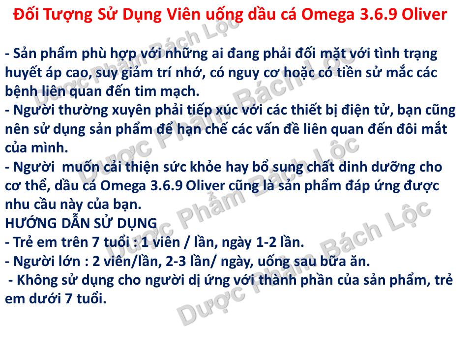 - O.m.e.g.a 3.6.9 Oliver Ngăn ngừa, phòng chống các bệnh liên quan đến tim mạch, cao huyết áp và nhồi máu cơ tim.