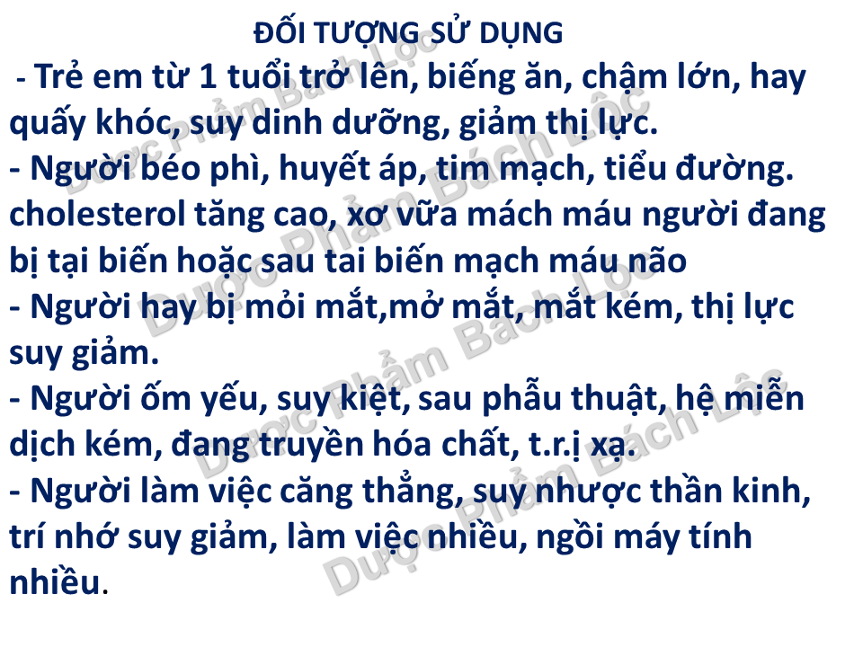 - Người làm việc căng thẳng, suy nhược thần kinh, trí nhớ suy giảm, làm việc nhiều, ngồi máy tính nhiều.
