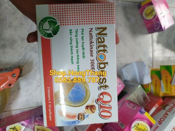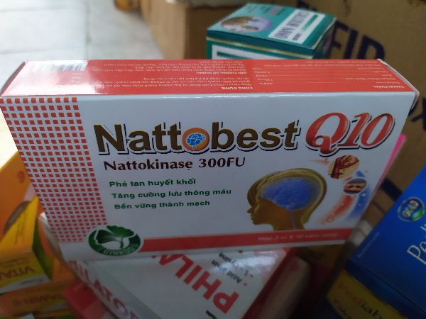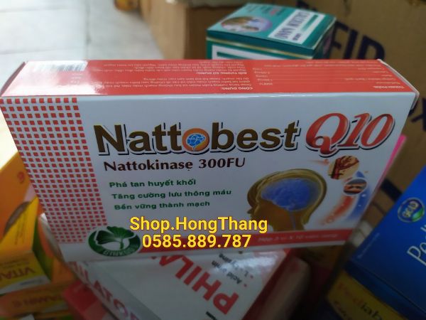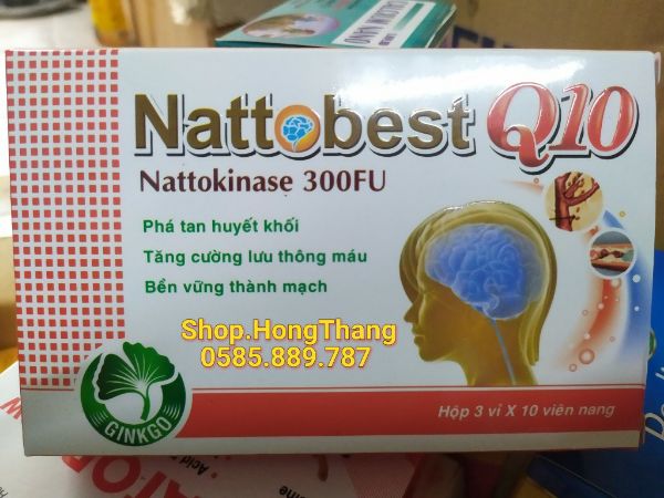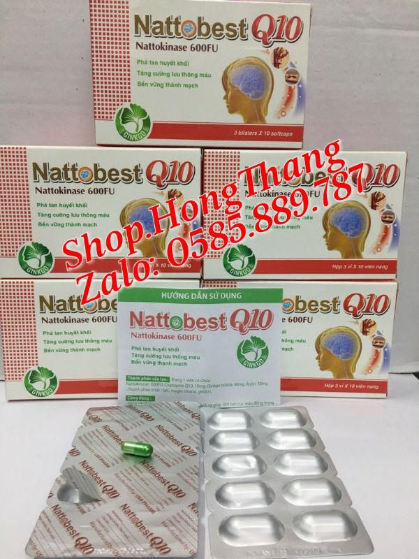 Thành phần của NattosBest Q10 :| Nattokinase 300FUCoenzym Q10 : 10mgGinkgo biloba : 80mgRutin:30mgTá dược vừa đủ một viên nangCông dụng:- Phòng ngừa và phá được các cục máu đông, tăng tuần hoàn và lưu thông máu.- Hỗ trợ và phòng ngừa tai biến mạch máu não và các di chứng của nó; các bệnh lý liên quan đến cục máu đông: viêm tắc động, tĩnh mạch, các biến chứng của bệnh tiểu đường, bệnh mạch vành, đau thắt ngực, nhồi máu cơ tim, suy giảm trí nhớ ở người già.- Hỗ trợ ổn định huyết áp.Hướng dẫn sử dụng:- Phòng và tăng cường sức khoẻ, ngày uống 2 lần, mỗi lần 1 - 2 viên trước bữa ăn 30 phút.- Hỗ trợ điều trị: Ngày uống 2 - 3 lần, mỗi lần 2 viên, trước bữa ăn 30 phút.Đóng gói: Hộp 3 vỉ x 10 viên.Bảo quản: Nơi khô mát, tránh ánh sáng.Để xa tầm tay trẻ em. Đọc kỹ hướng dẫn sử dụng trước khi dùng.Hạn sử dụng: 36 tháng kể từ ngày sản xuất.