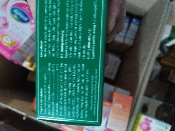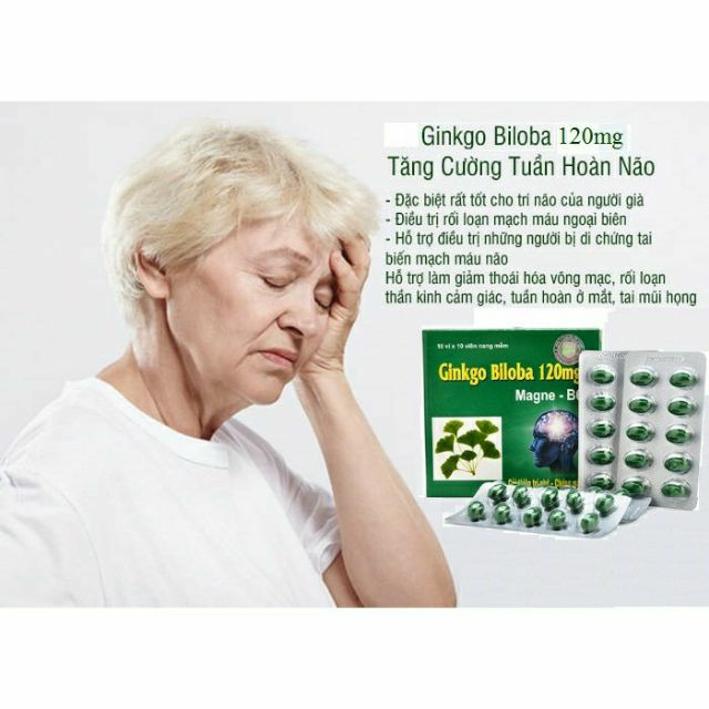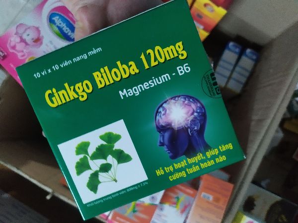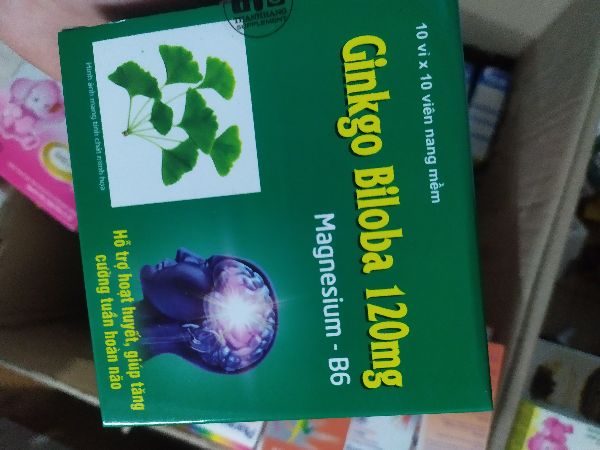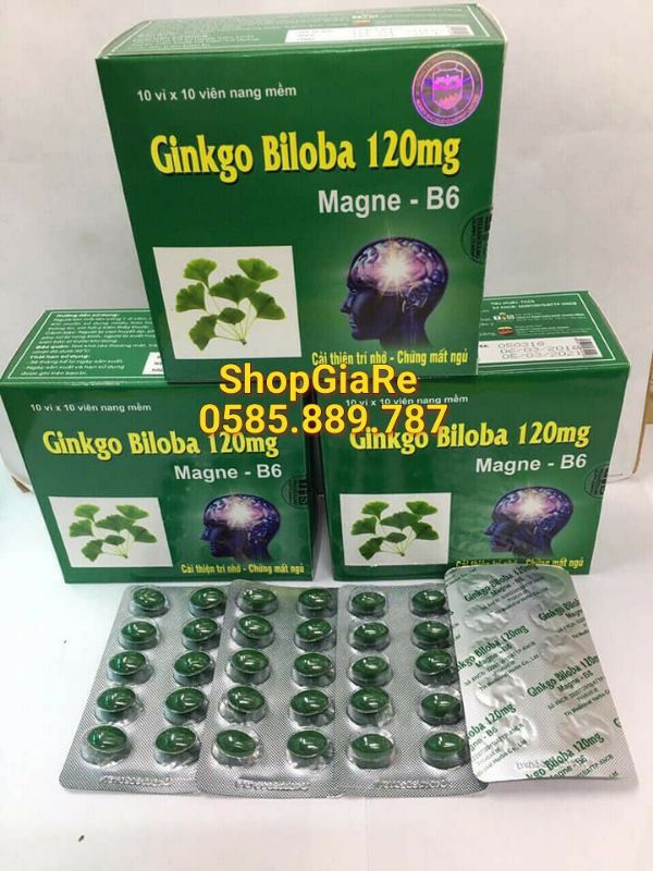 Thành phần:Ginkgo biloba 120 mgMagnesi oxyd 30 mgVitamin B6 1 mgGelatin 160mgSorbitol 3mgSoybean Oil 530mgLecithin 20mgBee wax 20mgVanillin 2mgTá dược vừa đủ 01 viênCông dụng:- Giúp dãn động mạch, tăng co bóp mạch máu, giảm tính thấm thành mạch máu, tăng tuần hoàn não, tăng dung nạp oxy ở não..- Tăng khả năng chú ý tập trung.- Cải thiện tình trạng suy giảm trí nhớ. Hỗ trợ đitrcác hội chúng có liên quan đến thiểu năng tuần hoàn não, rối loạn tâm thần tập tính ở tuổi già (như: giảm trí nhớ, đổi tính..), các rối loạn về mạch ngoại vi của tiểu tuần hoàn, ù tai, chóng mặt, đau đầu, mất ngủ.- Phòng ngừa và làm chậm tiến triển bệnh Alzheimer’s.Đối tượng sử dụng:- Dùng cho các trường hợp thiểu năng tuần hoàn não với các biểu hiện: suy giảm trí nhớ, đau đầu, hoa mắt, chóng mặt, mất ngủ, mất thăng bằng, suy nhược thần kinh.- Người làm việc trí óc căng thẳng, mệt mỏi.- Người bị viêm đau dây thần kinh, rối loạn tuần hoàn ngoại vi gây lạnh chân tay.Cách sử dụng:Người lớn ngày uống 02 lần mỗi lần 01 viên, uống sau ăn.Thời hạn sử dụng: 03 năm kể từ ngày sản xuất.Bảo quản: Nơi khô ráo, tránh ánh sáng.Quy cách đóng gói: Hộp 10 vỉ x 10 viên nangSĐK: 4678/2013/ATTP-XNCBSản phẩm này không phải là thuố, không có tác dụng thay thế thuố chữa bện