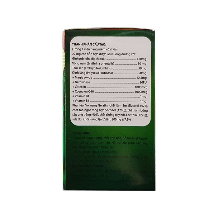Ginkgo Biloba 120mgVông nem 50mgTâm sen 50mgĐinh lăng 50mgMagie oxyde 12.5mgNattokinase 50FUCiticolin 1000mcgCoenzyme Q10 1000mcgVitamin B1 1mgVitamin B6 1mgPhụ liệu: Vỏ nang Gelatin, chất làm ẩm Glycerol, chất tạo ngọt tổng hợp Sorbitol, chất làm bóng sáp ong trắng, chất chống oxy hóa Lecithin vừa đủ.