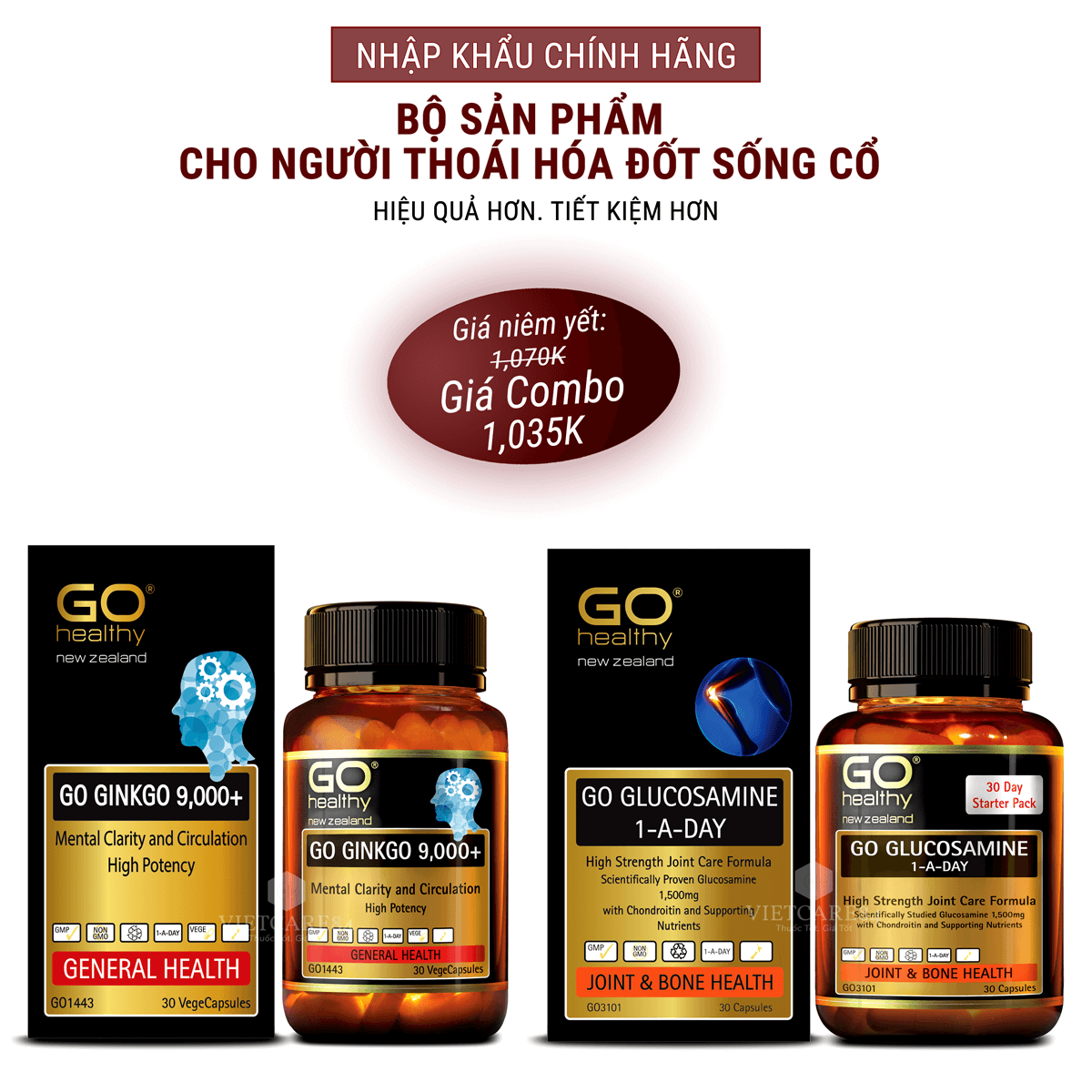 Bộ sản phẩm nhập khẩu chính hãng cho người bị thoái hóa đốt sống cổ gồm:+ Viên uống bổ não New Zealand GO GINKGO 9000+ (30 viên) + Viên uống bổ xương khớp New Zealand GO GLUCOSAMINE 1-A-DAY 1500mg (30 viên)