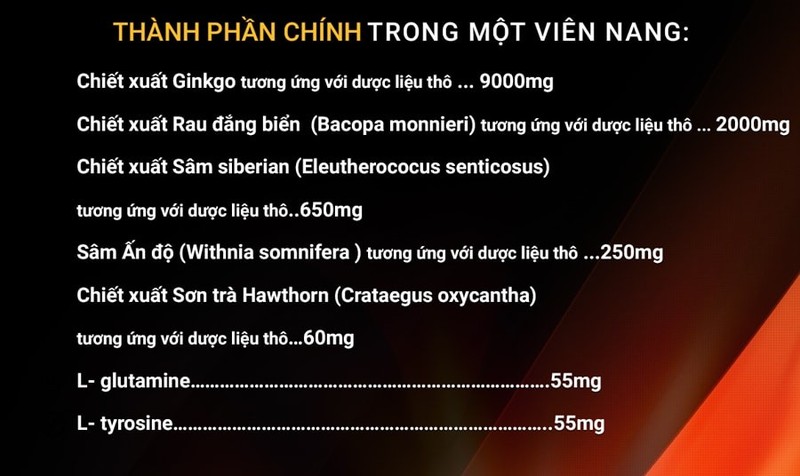 2. Công thức tối ưu nhất. Bạn khó có thể tìm được một sản phẩm bổ não kết hợp giữa hàm lượng Ginkgo cao (chiết xuất Ginkgo 9000mg) với chiết xuất Rau đắng biển (Bacopa monnieri)...2000mg và chiết xuất Sâm siberian (Eleutherococus senticosus)...650mg trong một viên nang