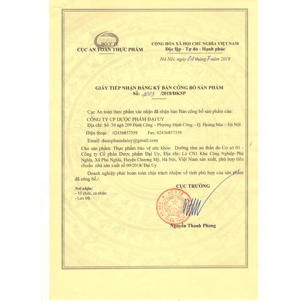 Dưỡng tâm an thần Đại Uy là sản phẩm của Công ty Cổ phần Dược phẩm Đại Uy là đơn vị với hơn 10 năm kinh nghiệm trong chế biến các loại thực phẩm bảo về sức khoẻ với dây chuyền sản xuất hiện đại, đội ngũ lao động lành nghề,
