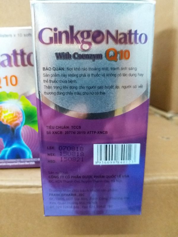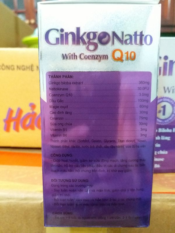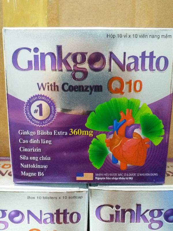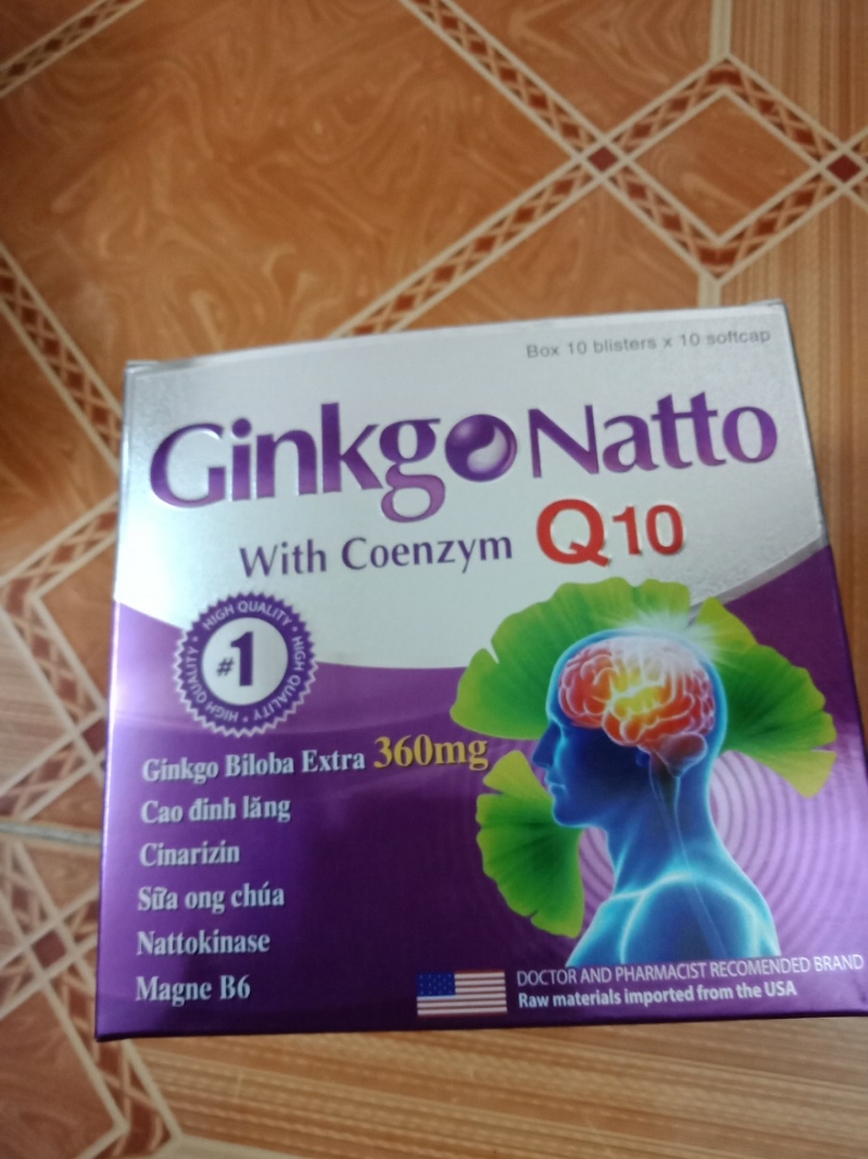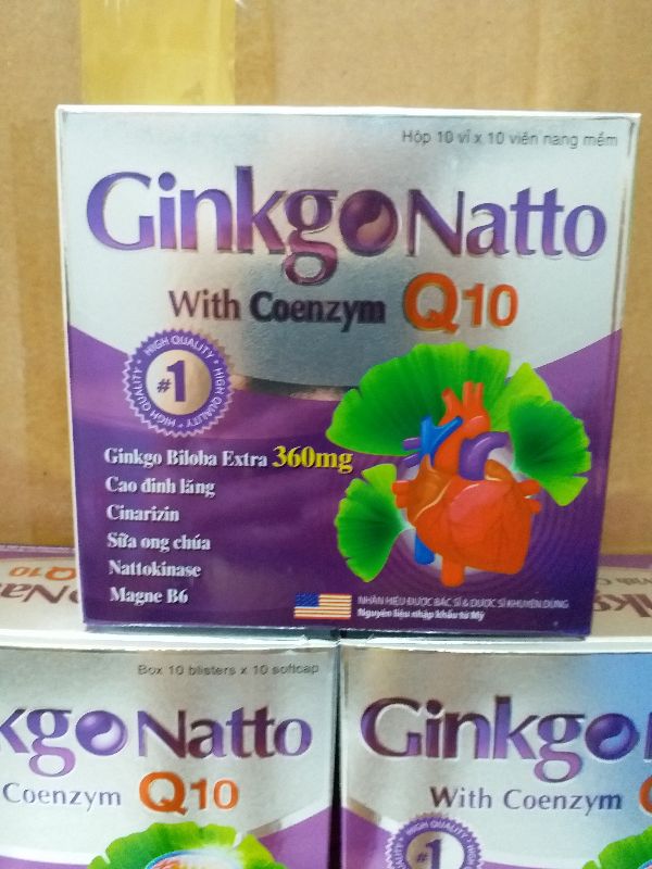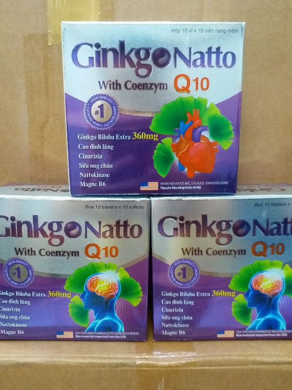 Ginkgo Natto with Coenzyme Q10THÀNH PHẦN - Ginkgo biloba ............................ 360mg.- Nattokinase .............................. 30FU- Coenzym Q10 ............................ 1.0mg.- Dầu gất .......................................100mg- Cinarizin ....................................75mg- Magnesium ................................. 60mg.- Cao đinh lăng ............................. 30mg.- Sữa ong chúa ............................. 30mg.- Vitamin B1 .................................... 3mg.- Vitamin B6 .................................... 3mg.- Phụ liệu.CÔNG DỤNG.- Giúp bổ sung dưỡng chất cho não, chống gốc tự do, bảo vệ và tăng cường hoạt động của não.- Hỗ trợ nâng cao trí nhớ, duy trì hoạt động cho não bộ.- Giúp phòng ngừa, giúp làm tan cục máu đông, tăng cường tuần hoàn và lưu thông mạch máu, hỗ trợ điề.u tr, phòng ngừa tai biến mạch máu não và các di chứng sau tai biến mạch máu não, ngăn ngừa di chứng ở các bệnh nhân mắc các bệnh về tim mạch.ĐỐI TƯỢNG SỬ DỤNG.- Người bị nhức đầu, ù tai, chóng mặt, suy giảm trí nhớ, kém tập trung, thiếu tỉnh táo, sa sút trí tuệ, rối loạn giấc ngủ do thiểu năng tuần hoàn não. Người bị tai biến mạch máu não, mắc các bệnh tim mạch.- Người khí huyết ứ trệ, lưu thông kém, lượng máu đến vùng vai gáy, cổ suy giảm gây đau mỏi vai gáy, tê cứng cổ.- Người đau mỏi cơ bắp, tê bì tay chân do thiếu máu, giảm tuần hoàn ở các chi gây chuột rút chân tay.- Người lao động trí óc, học tập căng thẳng.CÁCH DÙNG.- Người lớn và trẻ em trên 6 tuổi: 1 viên/lần x 3 lần/ngày.TRÌNH BÀY.Hộp 10 vỉ x 10 viên.NHÀ SX:Công ty cổ phần liên doanh USA, Hoàng Mai, Hà Nội