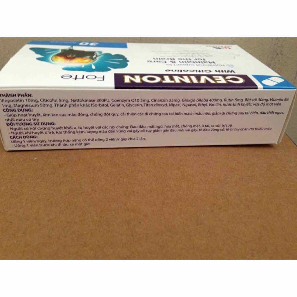 Công dụng:: Giúp hoạt huyết dưỡng não, làm tan cục máu đông và chống đột quỵ, Cevinton Forte cải thiện các di chứng sau tai biến mạch máu não, giảm di chứng sau tai biến, đau thắt ngực,nhồi máu cơ tim.